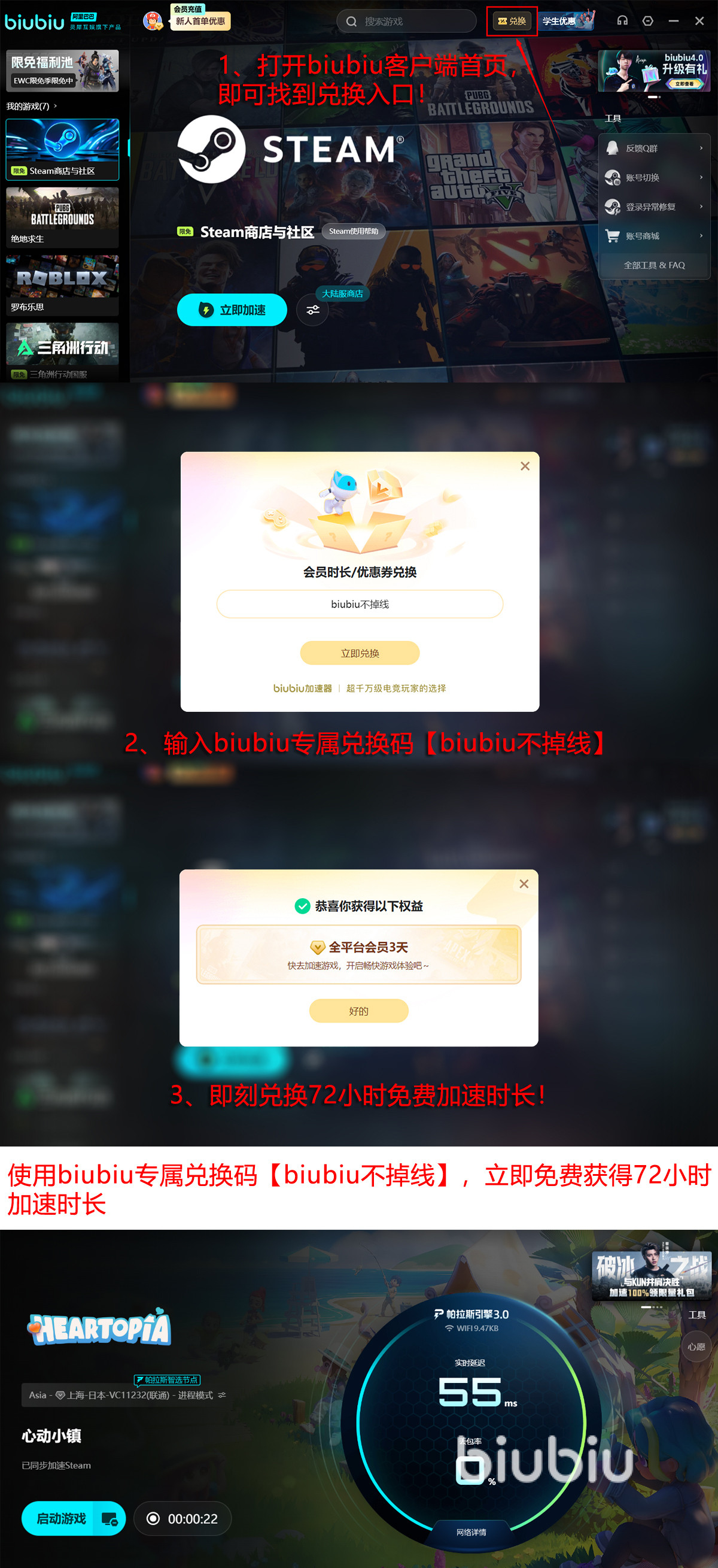 当前新用户注册即可领取24小时免费试用时长;若在激活页面输入专属口令【biubiu不掉线】,还可额外获得3天(即72小时)加速权限。两项叠加后,总计可享96个小时全功能体验,足够完成新手引导、房屋搭建、地图探索及多人联机全流程测试。