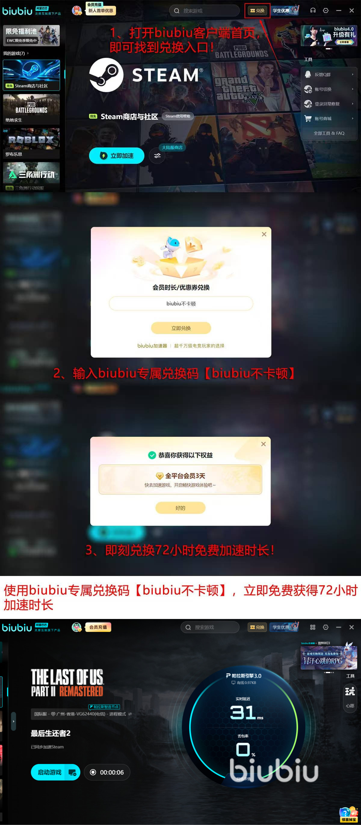 面向首次接触该工具的用户,biubiu提供分阶段体验权益:新注册账号即可激活24小时全功能试用权限;输入专属口令【biubiu不卡顿】,还可额外解锁72小时高级加速服务,累计享有96小时零门槛稳定运行体验,完整覆盖《最后生还者2》主线+DLC全流程所需时长。