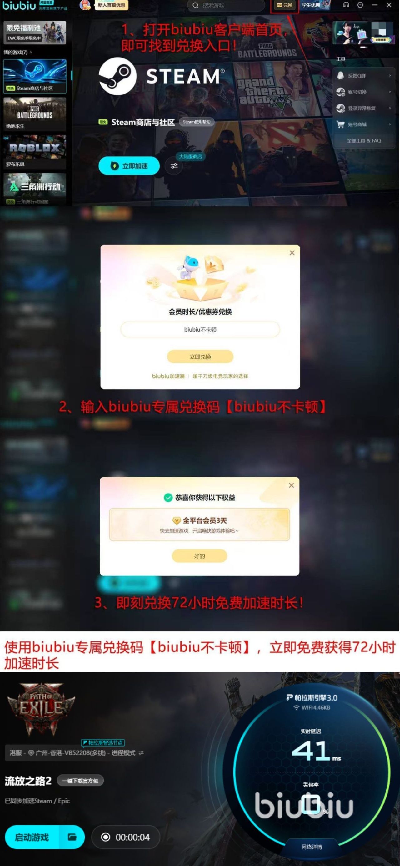 新用户注册后即可立即启用首日24小时顶级网络护航服务;输入激活码【biubiu不卡顿】,还可额外获得72小时极致加速体验,累计享96小时全功能试用,无需付费即可深度验证加速效果。