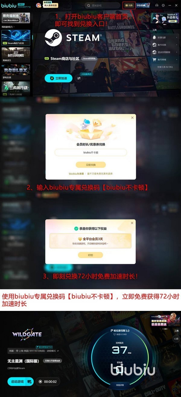 针对用户对加速效果的实际验证需求,biubiu加速器面向新注册用户提供24小时全功能免费试用权限,安装后自动激活。如需更长时间体验,可凭兑换码【biubiu不卡顿】在客户端主界面兑换3天全平台高级会员权益。此外,内置网络诊断模块支持一键修复LSP协议栈、重置Winsock配置、刷新DNS缓存等常见网络故障,适用于多种系统兼容性问题的快速响应。