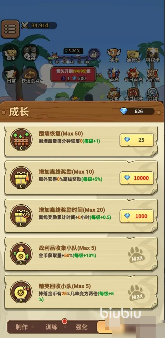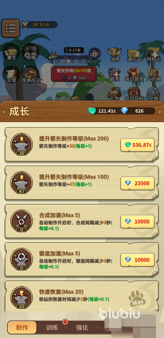 弓箭获取依赖制作系统,基础弓箭需通过铁砧合成,而铁砧为定时刷新资源,未及时领取将自动溢出消失,建议每日固定时段检查并收取。强化路径包含两条主线:其一为钻石升级,可显著提升基础攻击力;其二为同阶合成升阶,操作方式为消耗两个相同稀有度的弓箭完成进阶,该过程不消耗额外材料,但要求目标弓箭处于可合成状态。