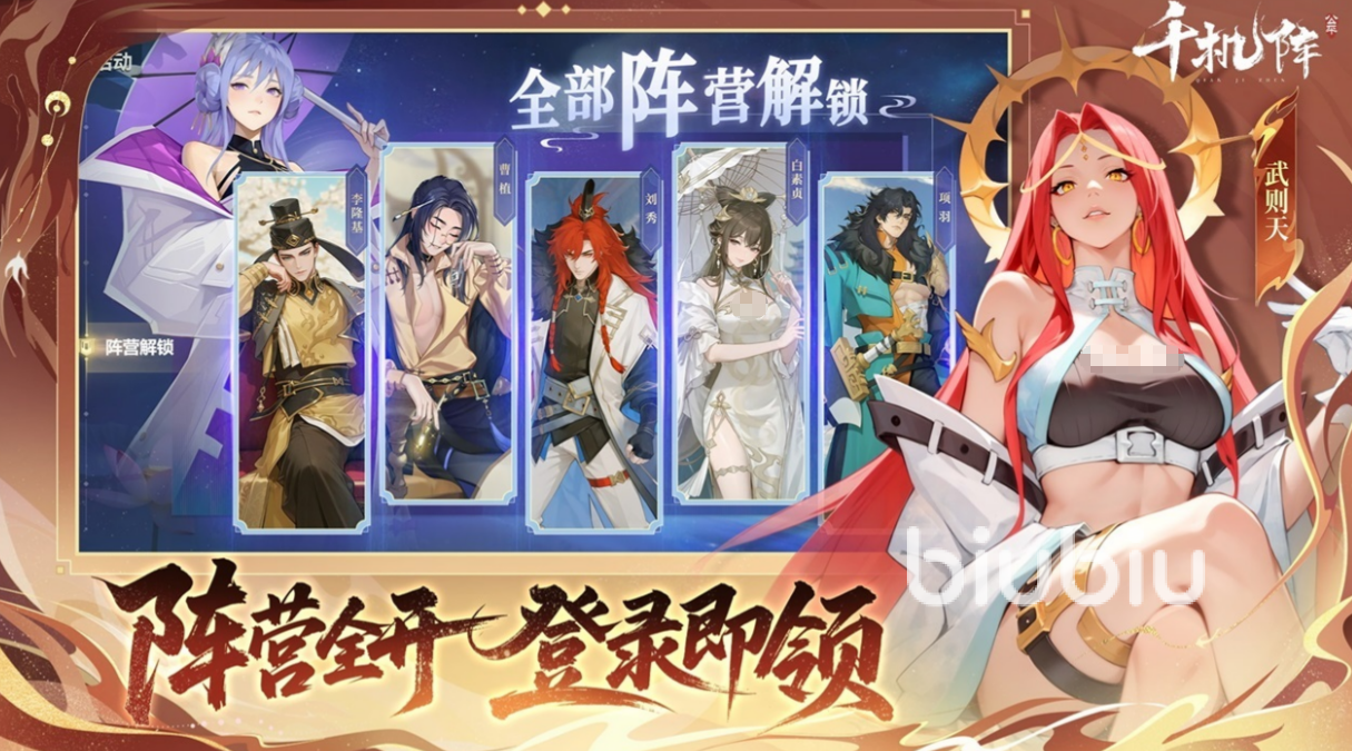 在角色体系构建上,《千机阵》深度挖掘东方文化谱系,将真实历史人物(如秦始皇、汉武帝、武则天)与经典志怪形象(如九尾狐、牛魔王)统一纳入世界观框架,并依据朝代归属与种族属性划分为秦、汉、唐、妖族四大阵营。各阵营间存在多维羁绊关系,同一阵容中若满足特定组合条件,可触发额外增益效果,大幅强化策略纵深感与阵容构筑自由度。
