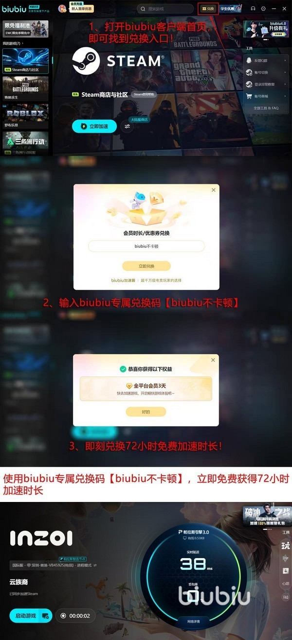 为降低用户尝试门槛,biubiu提供完善的免费试用机制:新注册用户自动获赠24小时全功能体验时长;另可通过兑换窗口输入专属口令“biubiu不卡顿”,额外领取72小时加速权限。该口令不限新老用户,区分大小写且限用一次。建议用户先使用初始时长,待到期后再激活兑换码,总计可享96小时无限制试用周期,充分验证实际效果。