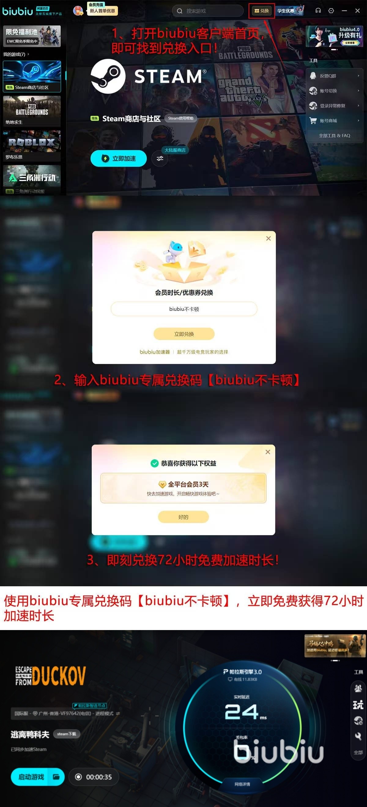 为降低新用户尝试门槛,biubiu加速器现推出限时福利:完成注册即可领取24小时全游戏加速时长;所有用户(含已注册账号)输入专属兑换码【biubiu不卡顿】,还可额外获赠72小时加速权限,累计达96小时。该权益覆盖《逃离鸭科夫》全部地图——包括但不限于雪地废墟、工业码头、沼泽哨站等随机生成场景,助力玩家稳定获取武器配件、医疗包、稀有鸭蛋道具等关键资源,持续享受高自由度、强随机性的战术生存乐趣。