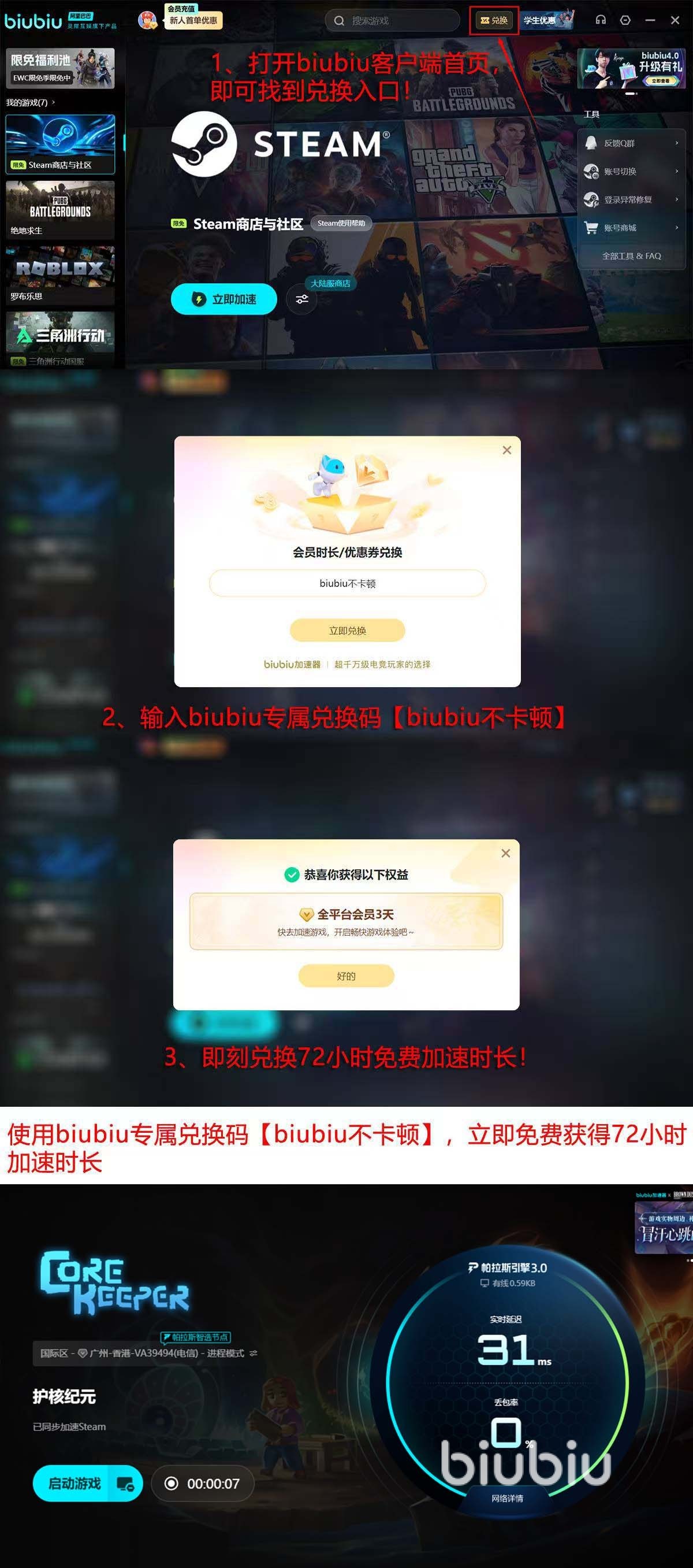 针对新用户,biubiu加速器提供总计96小时免费试用权限:注册即赠24小时基础时长;再通过首页“兑换”入口输入口令【biubiu不卡顿】,即可额外领取72小时高级服务时长。该权益覆盖完整下载流程与上线后全部游戏时段,确保玩家从安装到实战全程流畅无阻。