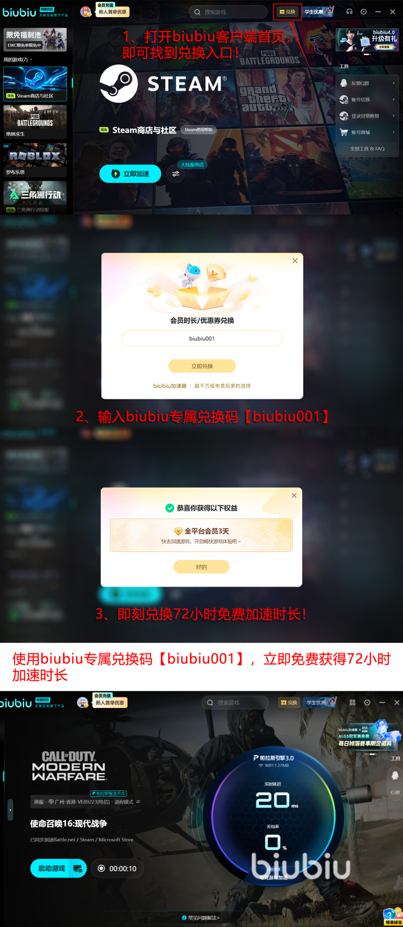 当前新用户可享24小时全功能免费试用。登录加速器后,在兑换中心输入激活口令【biubiu001】,即可立即领取三天高级加速权限。该权益自动到账,无需手动配置,叠加首登福利后总计可达96小时免付费使用时长。操作路径极简:搜索“使命召唤:现代战争2”→一键启用加速→即刻生效。目前,Biubiu加速器已获职业选手小叮当公开推荐,并成为Pero全球电竞赛事官方指定网络优化工具。九游、交易猫、biubiu加速器均为阿里巴巴灵犀互娱旗下产品APP。