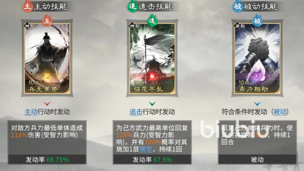 孙权技能配置侧重生存与团队增益:主动技选用【历战之躯】,可在群体挑衅期间恢复兵力,有效延长前排承伤时间;被动技推荐【缮甲历兵】,为全体友军提供抵挡状态,使队伍承受的敌方伤害降低80%,大幅强化阵容坦度。庞统则以【兵无常势】作为主力输出技,该技能对生命值低于40%的目标造成定点强化伤害,契合连环状态下的残血收割节奏。