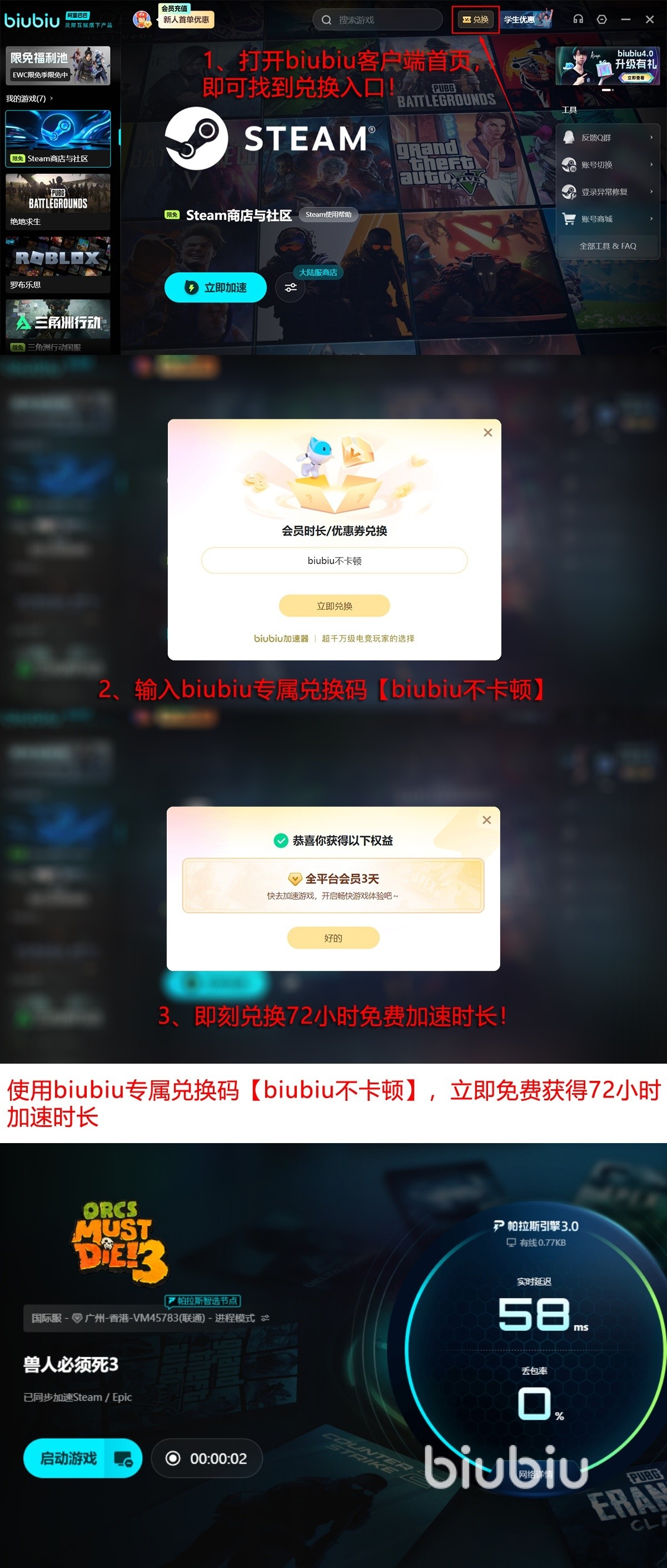 新用户注册即可获得24小时全平台免费试用权限,覆盖《兽人必须死3》在内的全部支持游戏。所有账户还可凭兑换码【biubiu不卡顿】额外激活72小时高级优化服务,期间不限次数启用一键加速功能,确保每场战斗均处于最优网络状态。