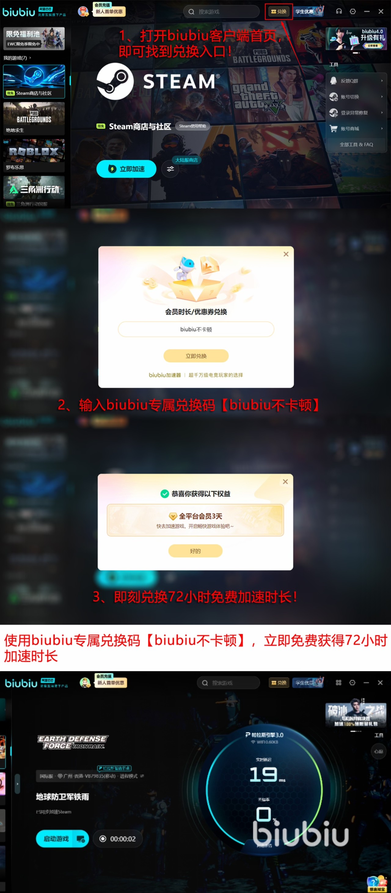 为降低新用户尝试门槛,biubiu加速器推出分层福利机制:注册即赠24小时全功能免费加速时长;完成新手引导后输入激活码【biubiu不掉线】,可额外领取连续3日高速通道使用权;新用户累计最高可享96小时无限制加速服务。所有加速过程均通过本地客户端直连实现,不修改系统HOST、不劫持DNS,保障账户与设备安全。