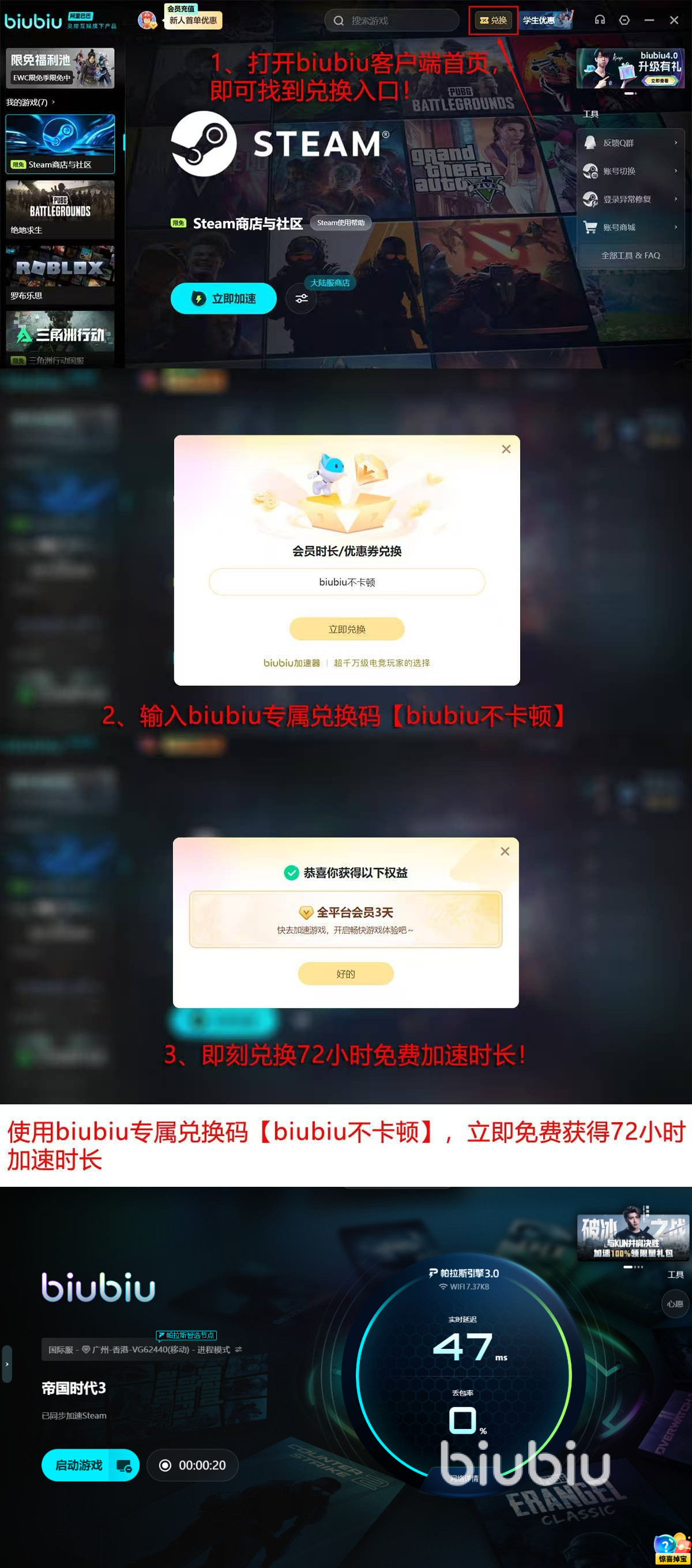 新用户完成注册即可获赠24小时全功能免费试用权限;激活专属口令【biubiu不卡顿】,额外解锁72小时高级加速服务。双周期叠加,总计可享受96小时零延迟实战体验,直观感受操作响应速度、战场态势同步精度与战术执行容错率的全面提升。