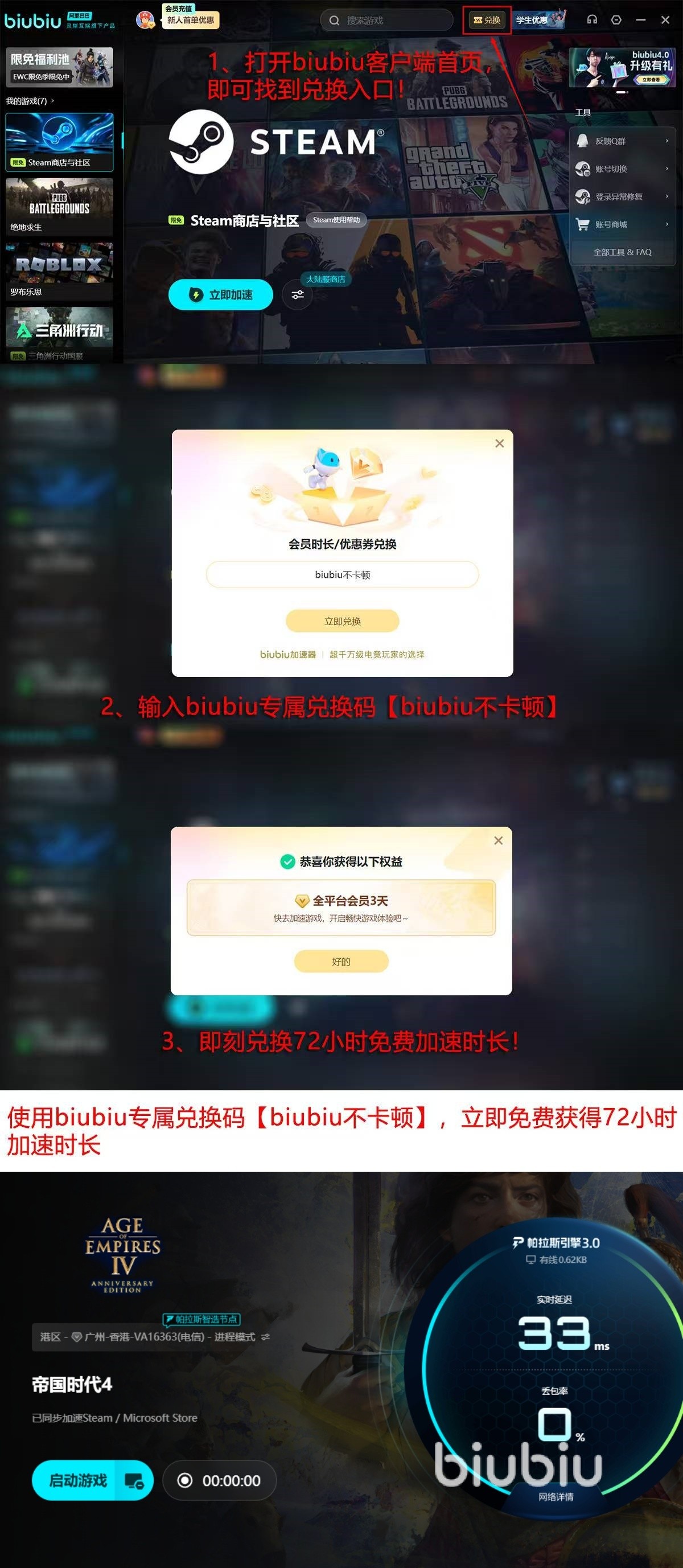 目前新用户注册即可获赠24小时全功能免费加速时长;输入兑换口令“biubiu不卡顿”,还可额外领取72小时加速权益,总计可连续使用达4天,全程无需绑定支付方式,无地域与设备类型限制。