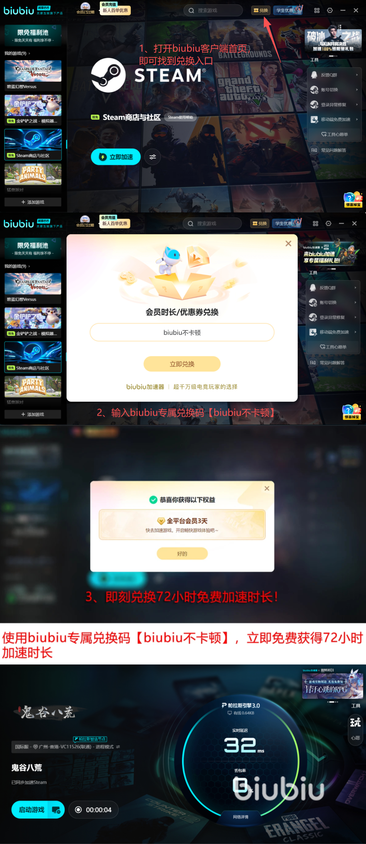 现推出限时加速权益:新用户注册即享24小时无门槛加速服务;输入激活码【biubiu不卡顿】,可额外获得72小时高性能节点使用权,累计免费体验时长达96小时。该权益覆盖全部《鬼谷八荒》在线功能模块,包括跨服宗门战、秘境组队副本及实时交易系统。