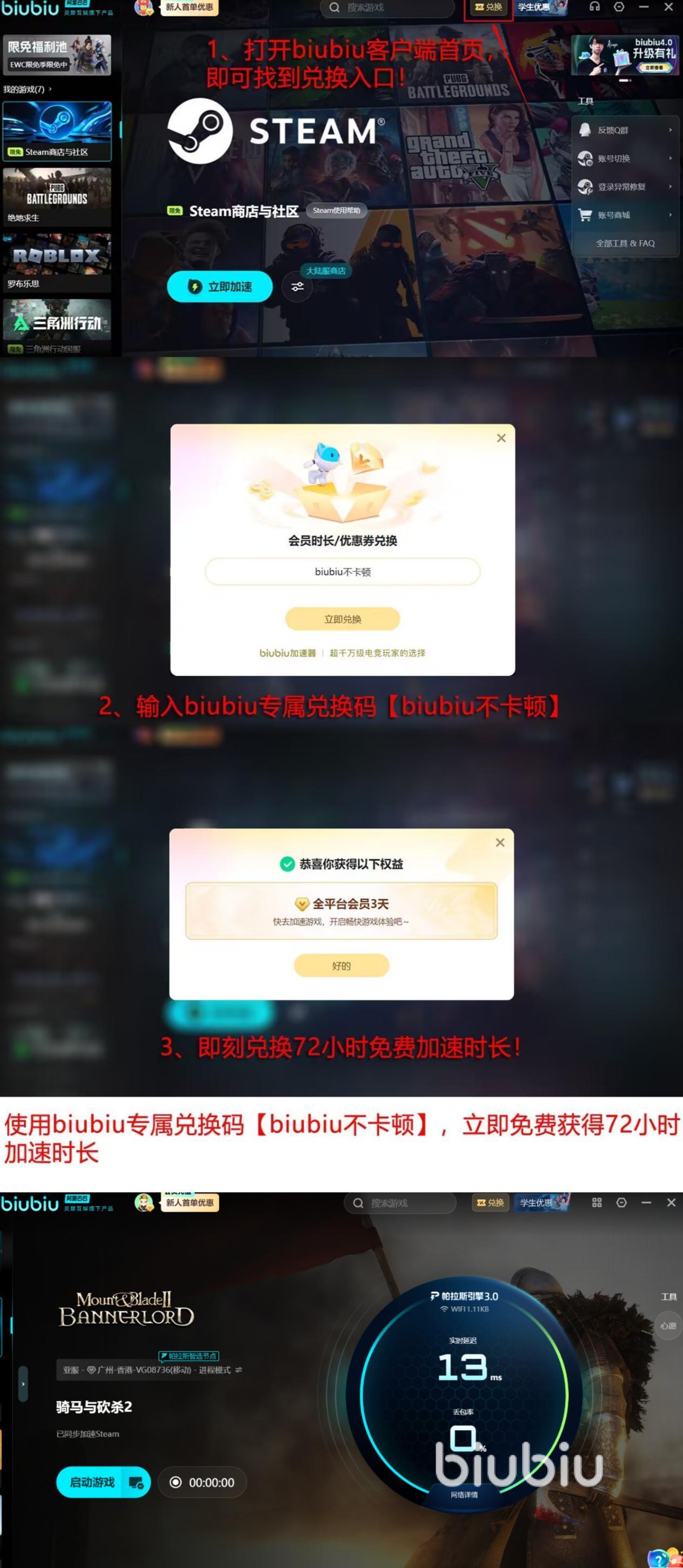 当前正值biubiu加速器服务推广期:新用户完成实名注册即可获赠24小时全功能试用权限;所有用户输入兑换码【biubiu不卡顿】,均可即时领取72小时加速时长。综合计算,首次注册用户最高可累计获得96小时无限制使用权益,覆盖完整新手适应周期与多场大型会战需求。