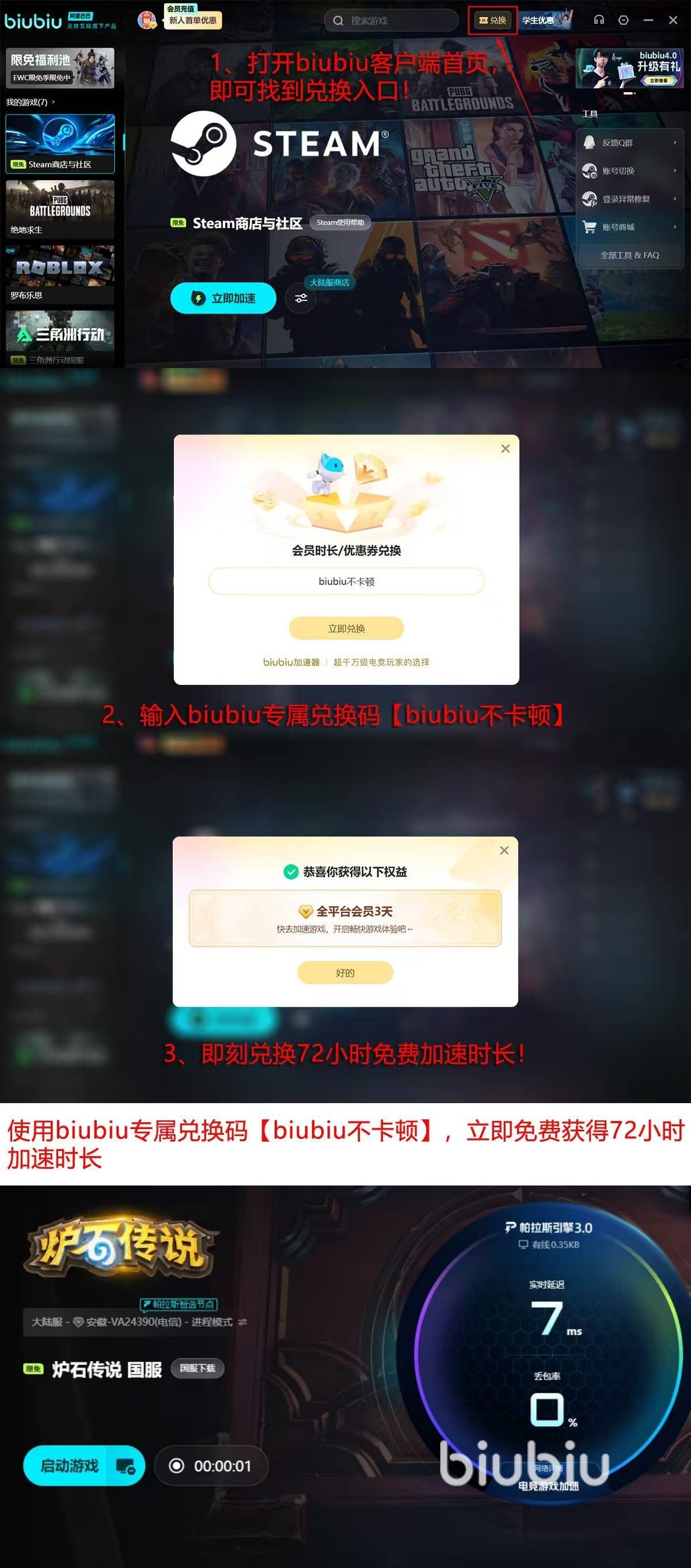 新用户注册后即可获得24小时全功能免费试用权限;完成账号绑定后,输入兑换口令“biubiu不卡顿”,还可额外激活72小时加速服务。两项权益支持叠加使用,总计可享连续96小时无限制加速体验,覆盖完整测试周期,便于充分评估优化效果。