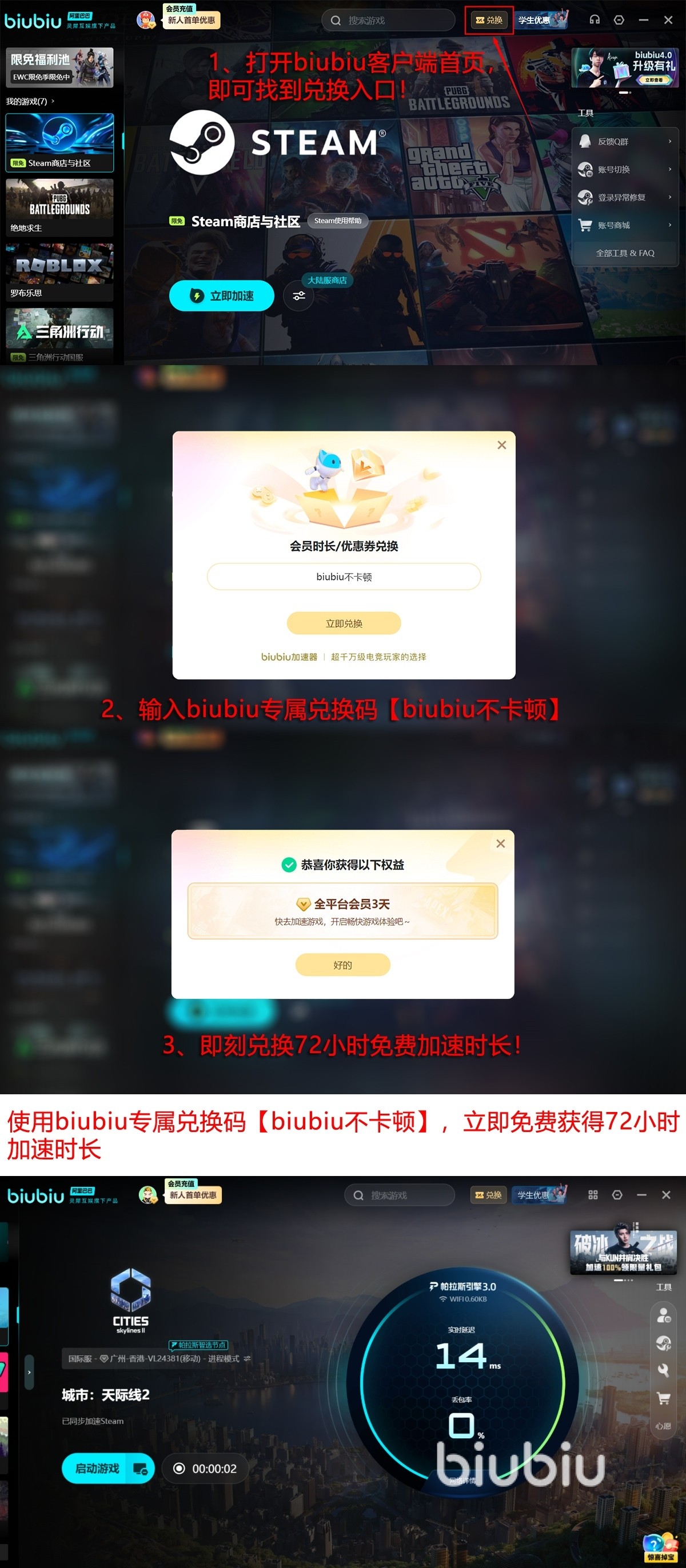 当前新用户注册即可获赠24小时全节点免费加速时长,覆盖全部服务器区域,无需验证即可实测效果。输入专属兑换码【biubiu不卡顿】,还可额外领取72小时加速权益。新老用户叠加使用后,最高可享累计96小时稳定加速服务,充分满足中大型城市长期建设与维护所需。