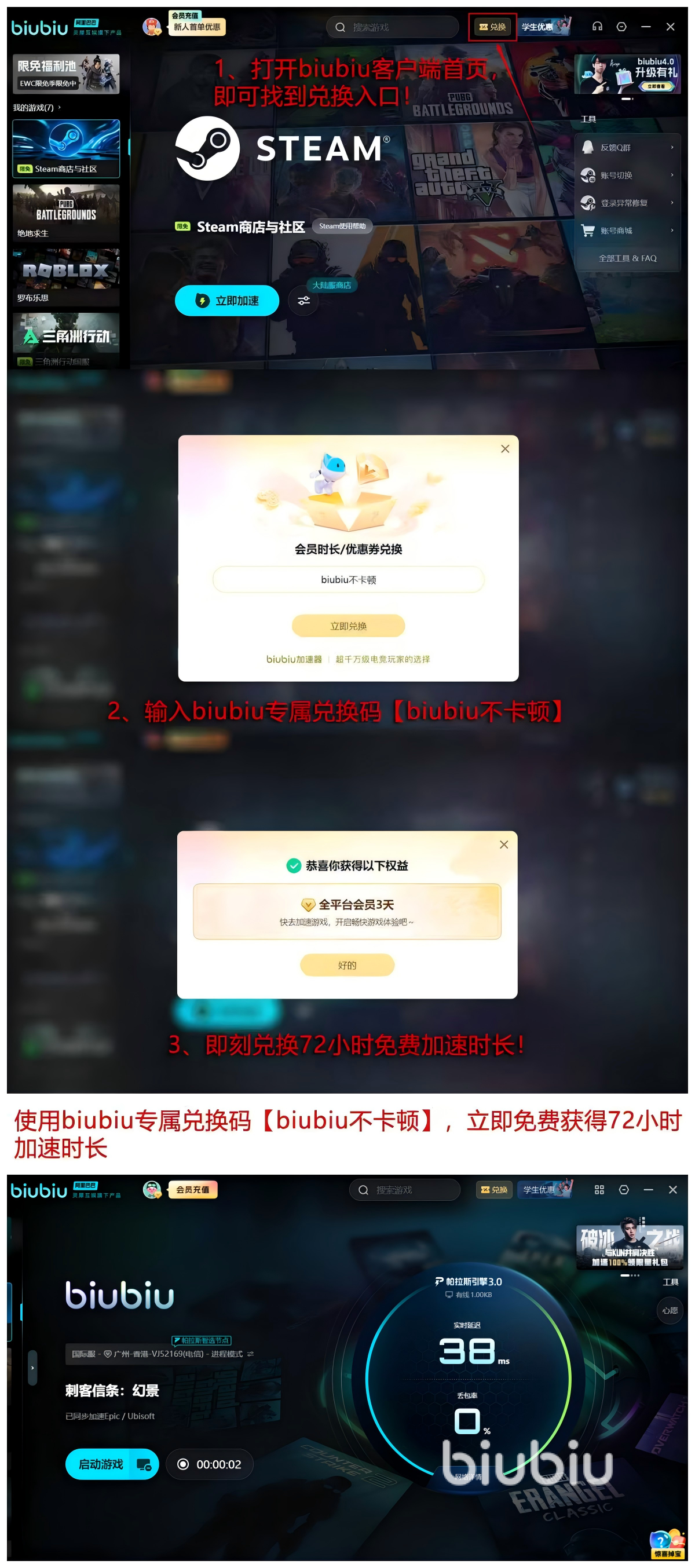 新用户注册后输入口令【biubiu不卡顿】,即可领取72小时黄金会员权益;叠加首登奖励,总计可享96小时全功能加速服务。该周期内可完整使用智能带宽调度、专属游戏DNS、跨服低延迟通道等全部特性,有效缓解因网络抖动引发的连接中断与加载失败问题。