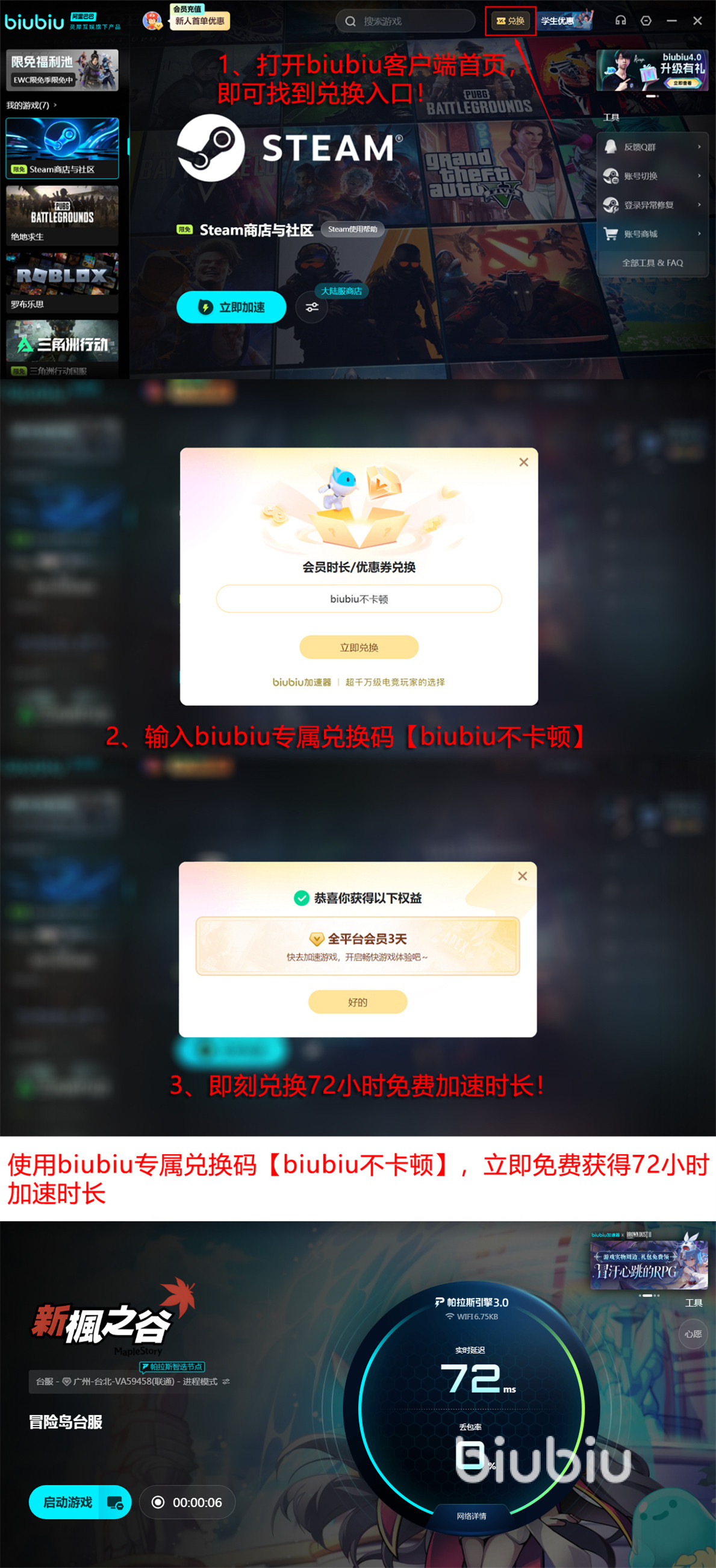目前biubiu加速器面向新老用户提供限时福利:输入兑换码【biubiu不卡顿】,即可领取72小时通用加速时长(每个账号限兑一次)。新注册用户建议先使用系统赠送的24小时体验资格进行实测,再激活兑换码,合计可享96小时连续加速服务,大幅提升游戏流畅度与联机稳定性。