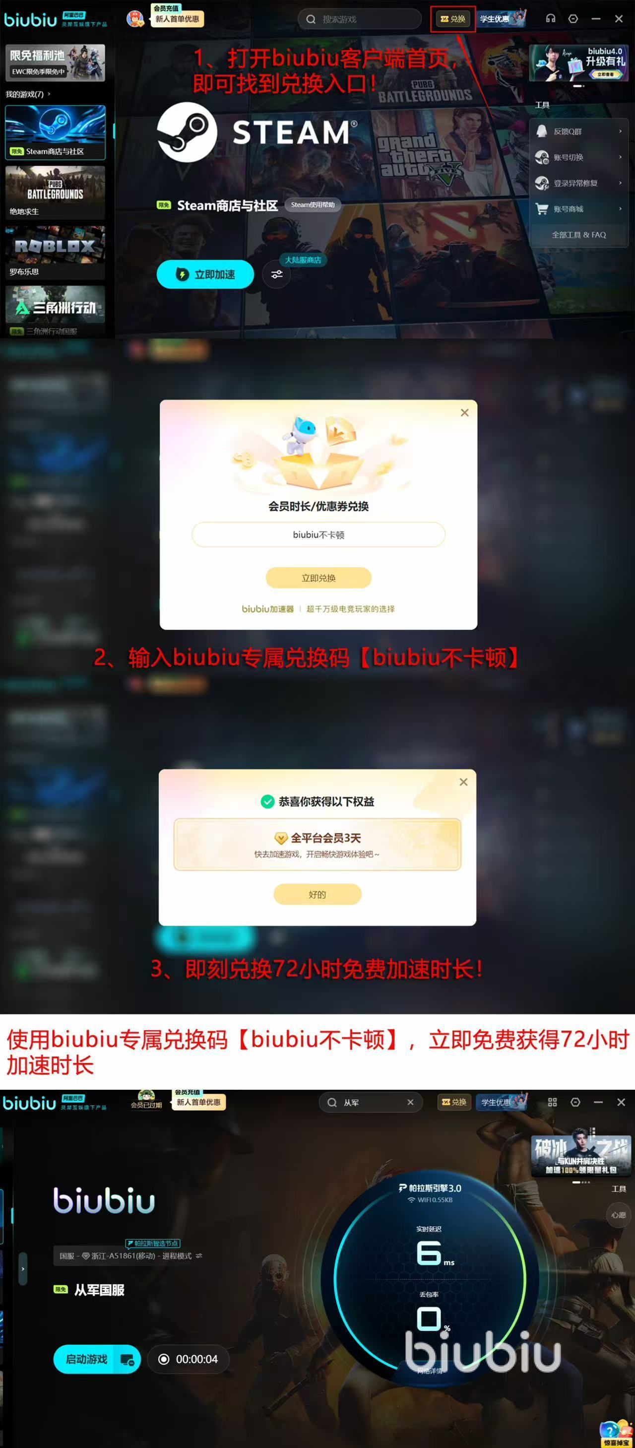 目前biubiu加速器推出限时双福利活动:新用户完成注册后,可立即领取首日24小时全游戏加速时长;所有用户(含老用户)输入专属口令【biubiu不卡顿】,即可额外获得3天加速权益。两项权益可叠加使用,新用户最高可享总计96小时的免费加速体验。支持先试用后付费,零风险验证实际效果。