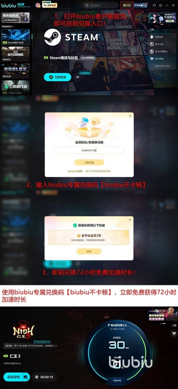 biubiu加速器由阿里巴巴灵犀互娱研发,与九游、交易猫同属其旗下产品矩阵。当前已升级至帕拉斯引擎3.0架构,支持动态带宽分配与协议层深度优化。该版本经职业电竞选手xdd实测验证,确认在《绝地求生》等高并发联机场景中具备稳定低延迟表现。新用户注册即可获得24小时基础体验时长,叠加口令“biubiu不卡顿”可额外解锁72小时服务权限,总计达96小时。针对《仁王3》玩家,平台特别推出限时免费加速活动,有效期覆盖1月29日至2月13日。