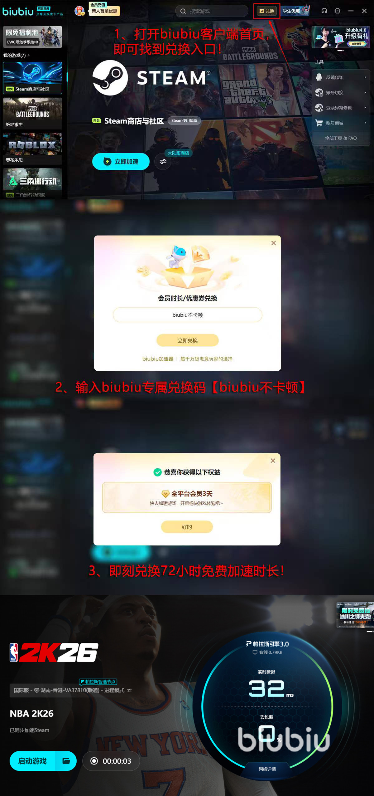 对于高度依赖实时同步的NBA2K26而言,网络质量直接决定操作反馈精度与模式完整性。目前新用户注册即可获赠24小时免费试用时长;登录后进入首页“兑换”页面,输入口令【biubiu不卡顿】,还可额外领取72小时,累计可达96小时无限制体验。