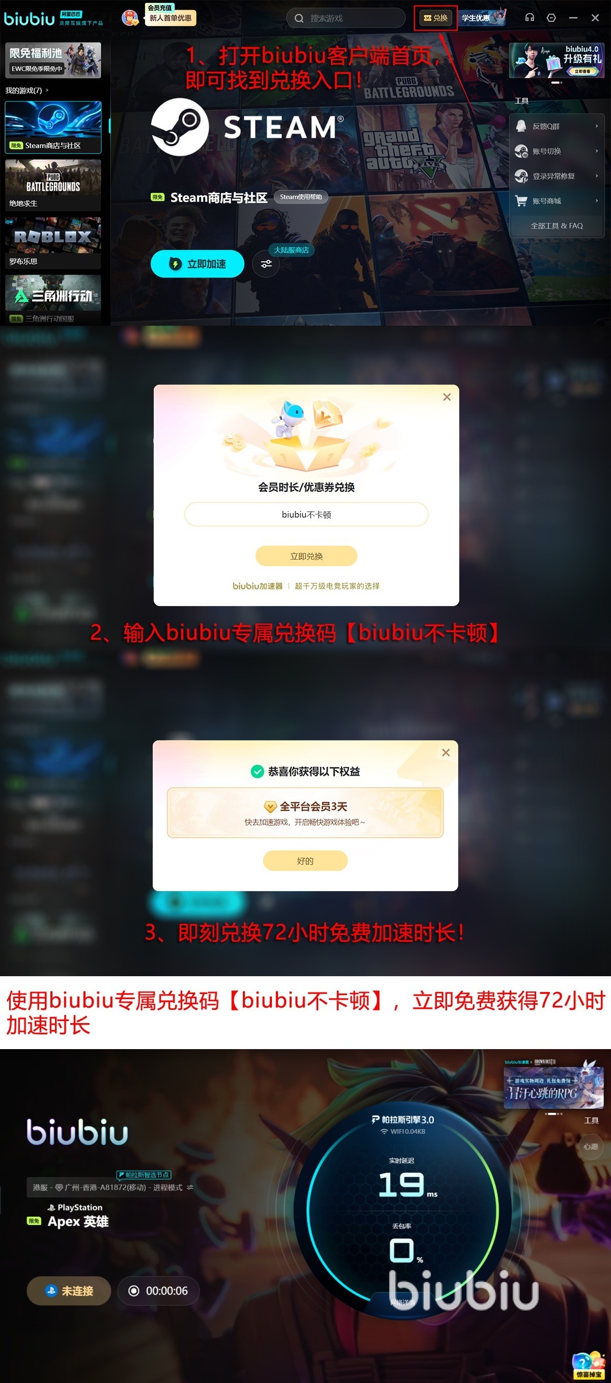 目前新用户可通过本文入口完成下载注册,登录后立即领取24小时官方授权免费体验时长。所有用户还可参与【biubiu不卡顿】限时兑换活动,额外获得3天全功能加速权益。新用户两项福利叠加,最高可享96小时连续加速服务。