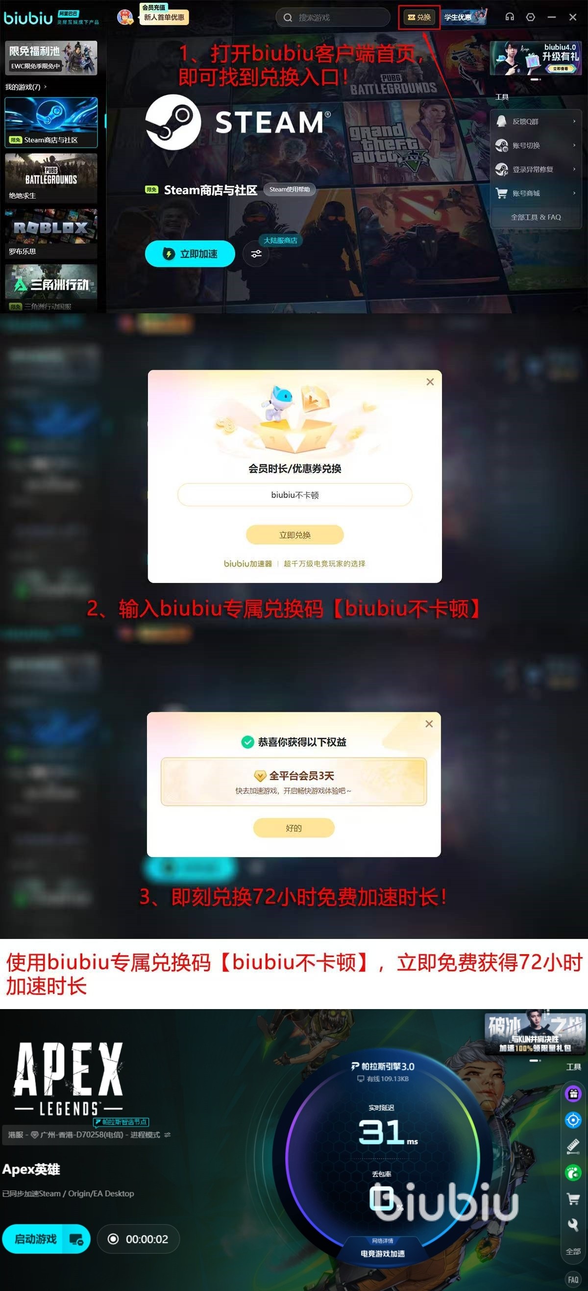 最后还有一个理由,这最后一个理由和加速器的福利有关系,就目前来看没有加速器的福利可以和这款加速器比的,因为该加速器中玩家只要输入了【biubiu不卡顿】兑换码那就可以兑换72小时的使用时长,之后如果在这个基础上大家刚好又是新用户的话,那么还可以领取到额外的24小时免费加速时长,这个时长是专为新用户所准备的,这么一来算下来的话正好能拿到96小时的免费加速时长,可以让用户白嫖很久很久就这个福利力度来看,确实是可以说是行业之最的没有加速器可以和其比,也正因为拥有这样的福利和加速效果才推荐大家去使用。