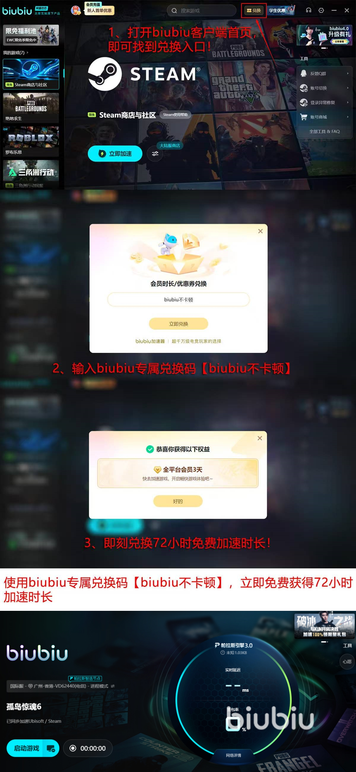 除了拥有好的加速效果外,还有非常不错的福利内容,后续在登录加速器后输入【biubiu不卡顿】兑换码即可领取72小时的免费加速时长,之后在这个基础上如果还是新用户的话那么还可以在领取24小时的免费加速时间,总计就是96小时的免费使用时间,这个给到的免费使用时间也是其它加速器所给不到的,最后在加速过程中还会发现加速器游戏库中,拥有大量游戏可以找到市面上能看到的几乎所有的热门游戏,就说可以满足除了这游戏外其它游戏的加速需求。