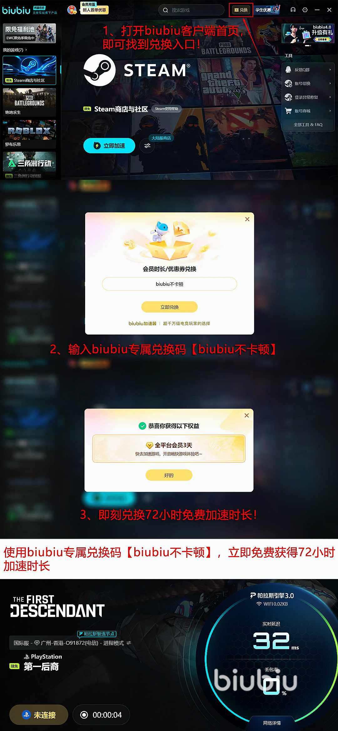 同时biubiu提供的福利方面同样诚意满满,新用户完成biubiu加速器注册后,无需额外操作就能直接领取24小时免费加速权益,全部用户只需输入兑换码【biubiu不卡顿】就能额外再申领3天免费加速时长,其中新用户两项福利叠加后累计可轻松获得足足96小时的免费加速。