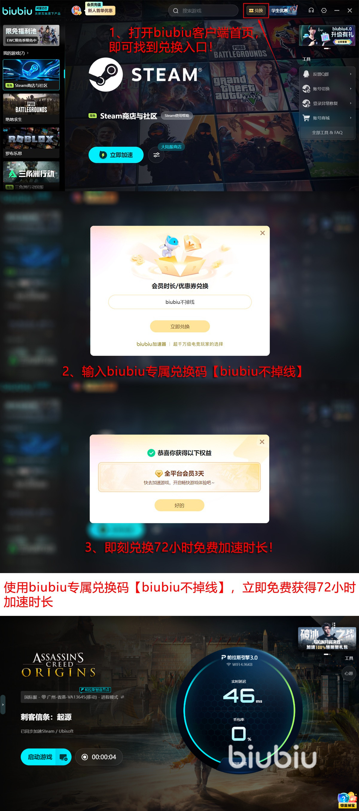 新用户专享重磅福利已开启,注册即送24小时全功能免费体验,输入【biubiu不掉线】,额外解锁零闪退的埃及之旅72小时,双福利叠加,享受总计96小时的高品质游戏网络,彻底告别国际服连接烦恼。