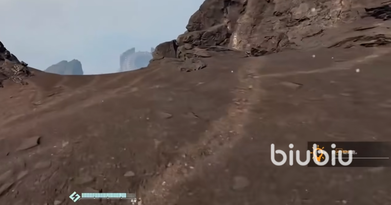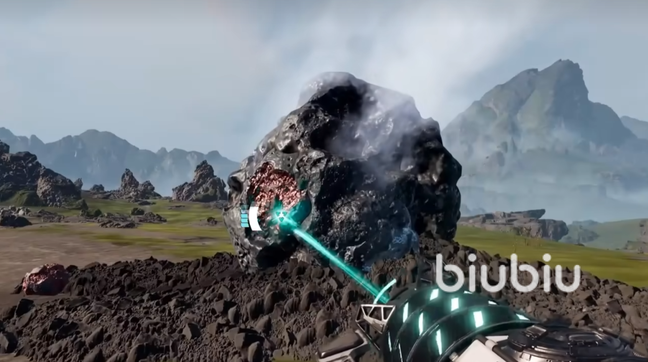 第一个采集陨石任务中,最先教的就是奔跑,我们使用左shift键位就能跑起来,加快移动,不过这是需要消耗能量的,注意节奏。在遇到部分有坡度的地形,可以利用shfit+ctrl键位来实现滑铲,这样能更快速的滑过。很快我们就会来到一个巨大的陨石核心这里,使用1或者转动滚轮就能召唤出来采集器了。小技巧告诉各位,陨石较大,上面会有些颜色不同的点,先对准这里会比较好采集。