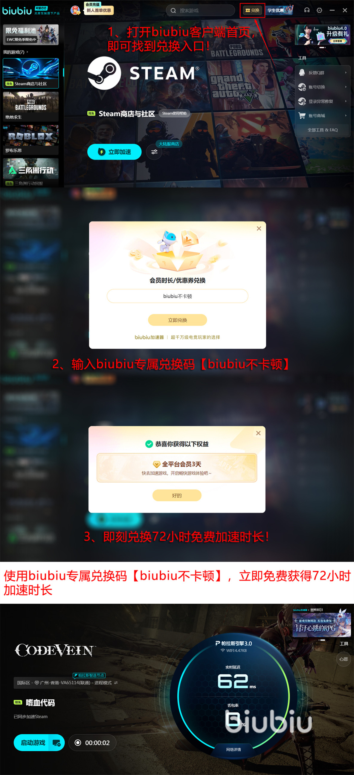 最后介绍一下福利方面,biubiu有两项福利,第一项新号免费加速24小时,第二项每个号都能通过输入兑换码【biubiu不卡顿】得到72小时免费加速时间。这样计算下来新号有96小时的免费加速时长,足以打消关于性能方面的疑虑。