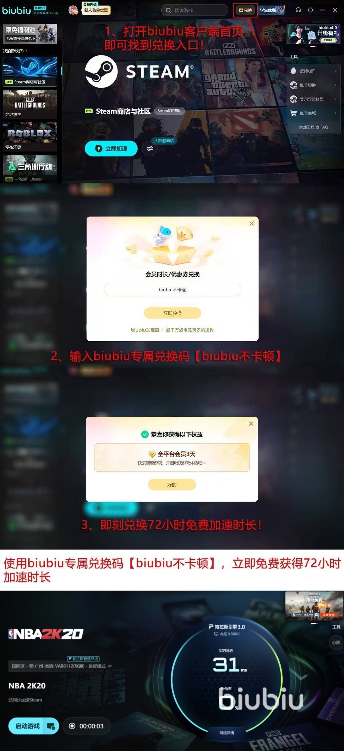 为了能够降低大家的使用门槛,现在biubiu为伙伴们准备了很多惊喜福利,比如第一次的注册是能够获取到平台为大家准备24h全平台限免使用权限;而针对于平台的所有用户来讲,兑换界面成功的输入【biubiu不卡顿】这句口令,就能够成功的兑换到72个小时免费体验时间。近百小时免费体验时间,足够让大家参与到高强度的对战模式中,近百款热门游戏任意体验。