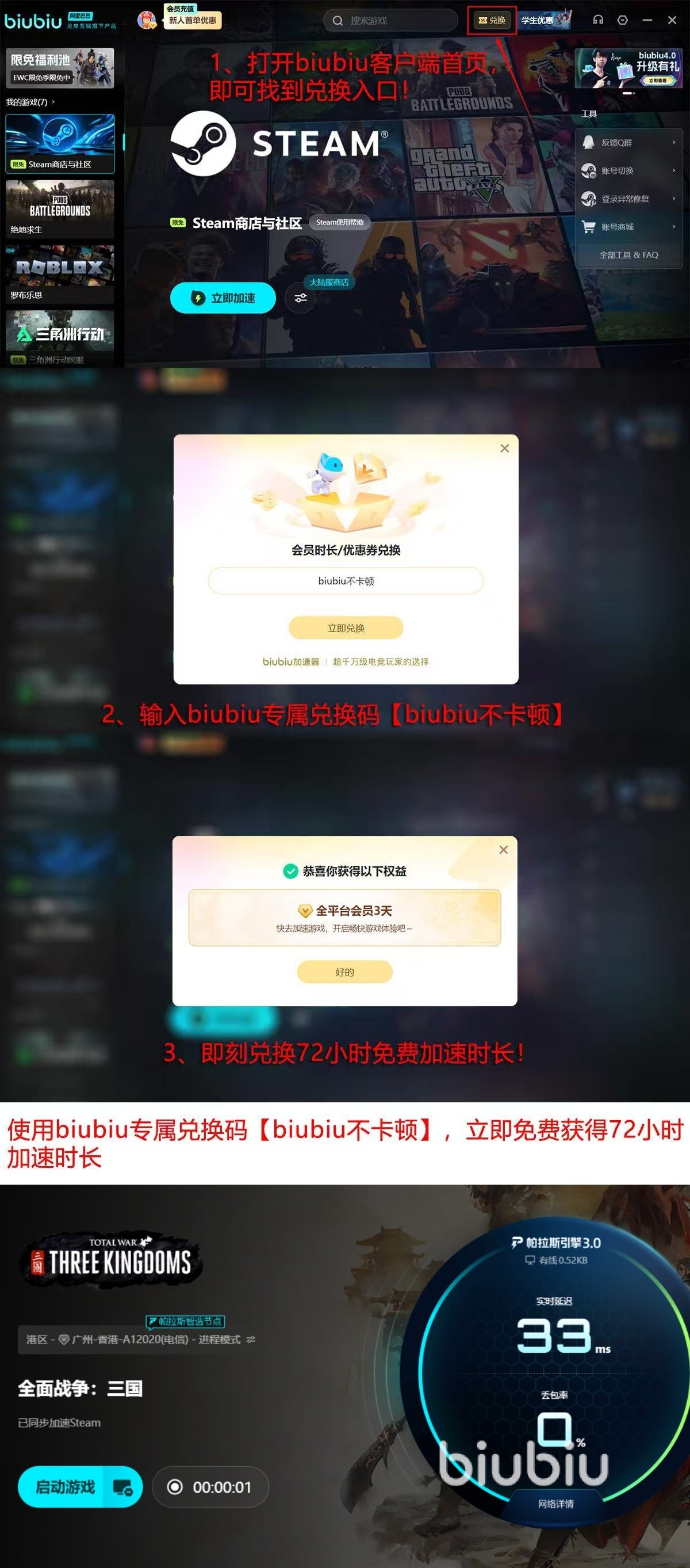 现在biubiu对于新用户还有着额外的福利。咱们在第一次进入程序的时候是可以获取到免费的24小时的加速时间,假设使用兑换码【biubiu不卡顿】的话则是可以额外的获取到3天的免费加速,总共可以让玩家们获取到96小时的免费加速