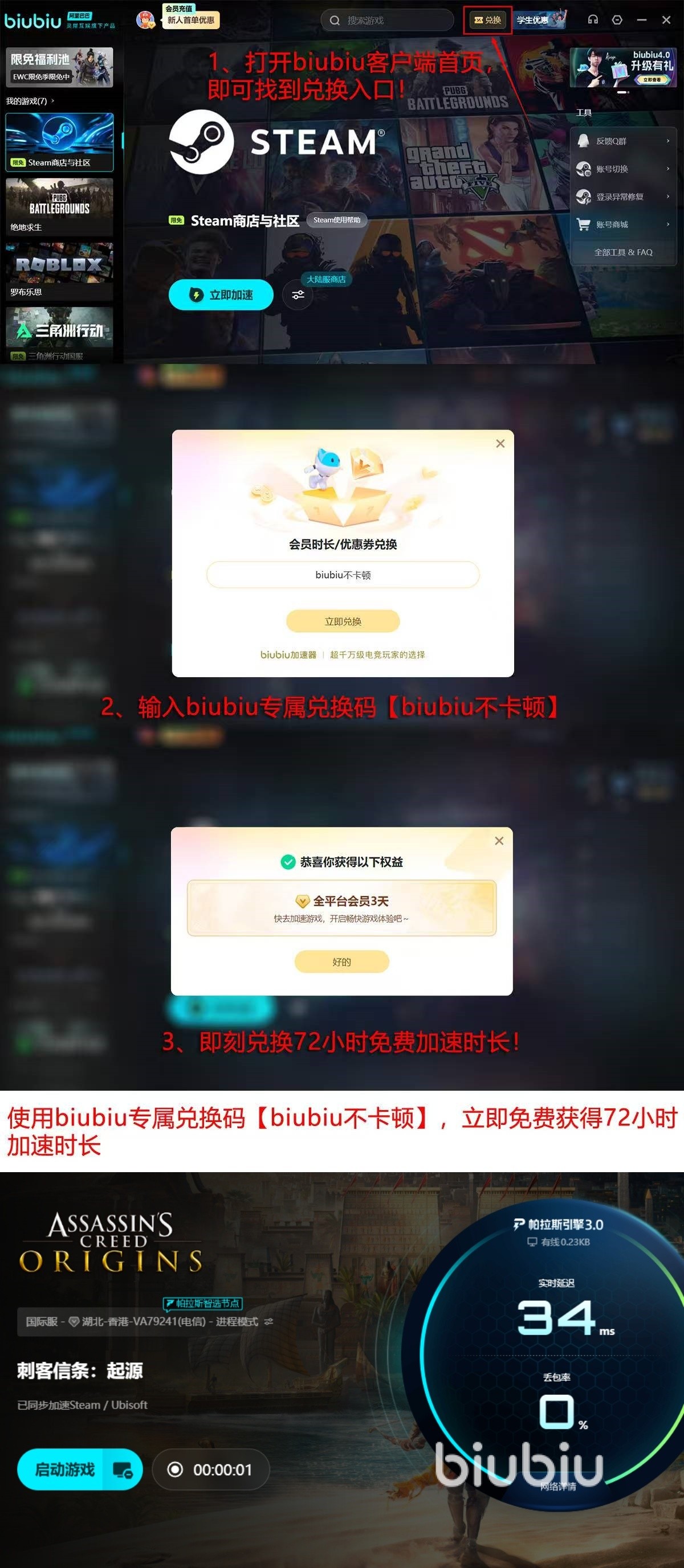 新用户注册后可立即获得24小时全游戏免费加速权益;输入专属兑换码【biubiu不卡顿】,还可额外激活3天高级加速服务,无需绑定支付方式即可体验完整功能。