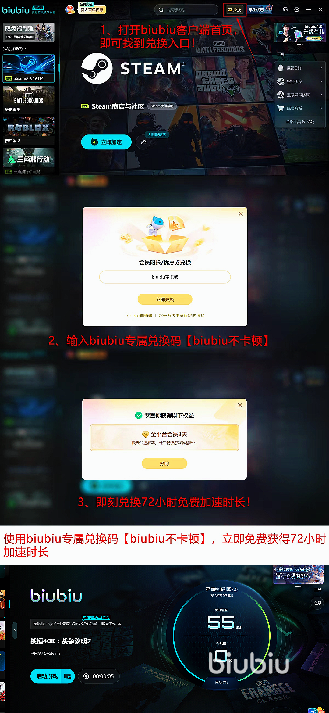 为降低玩家体验门槛,biubiu加速器持续开放多项限时福利:输入通用兑换码【biubiu不卡顿】,即可额外获得3天全场游戏加速权益;新注册用户完成账号绑定后,自动发放24小时全游戏免费加速时长。两项福利叠加,新用户最高可享96小时无限制加速服务。