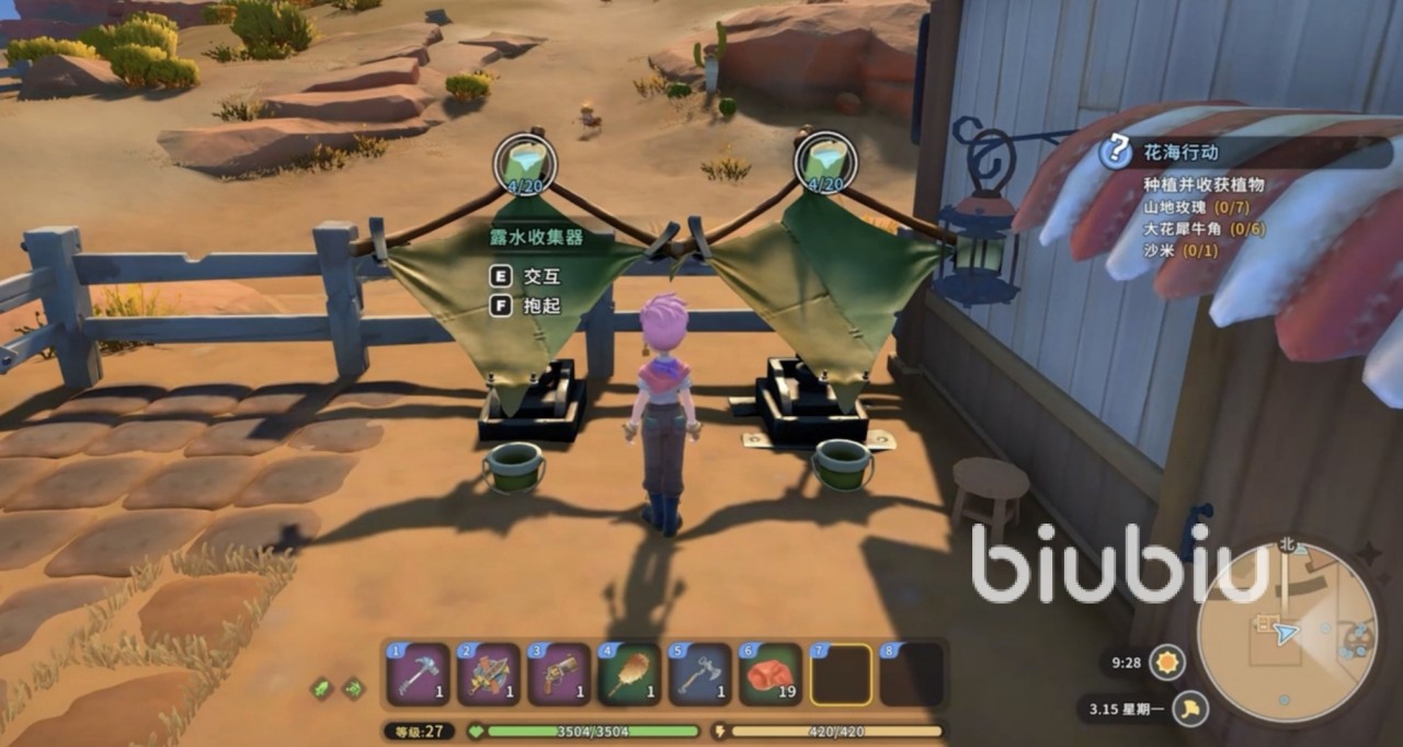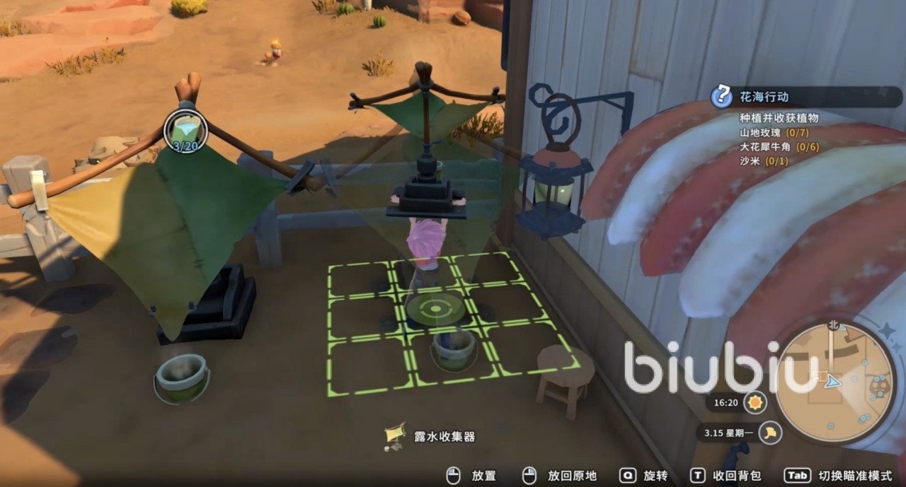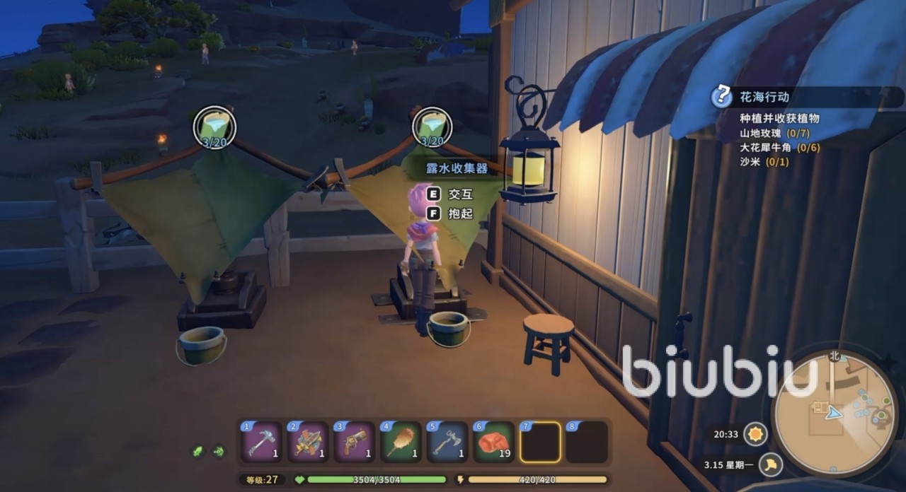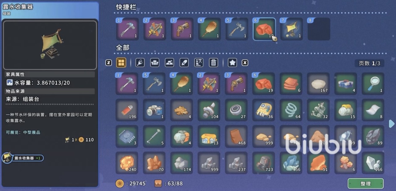 除手动采集外,露水还可作为副产物随其他行为随机产出——当玩家进行采石作业或砍伐树木时,有几率掉落少量露水,建议同步拾取以提升资源利用率。更高效的方式是部署“露水收集器”:该装置需先在齐恒处获取图纸,并使用数据光盘完成解析;制作材料固定为木棒×3、简易皮革×3、大理石砖×2、石槽×2;建成后须置于户外空地,其夜间工作效率最高,玩家可在次日正午前完成收取。