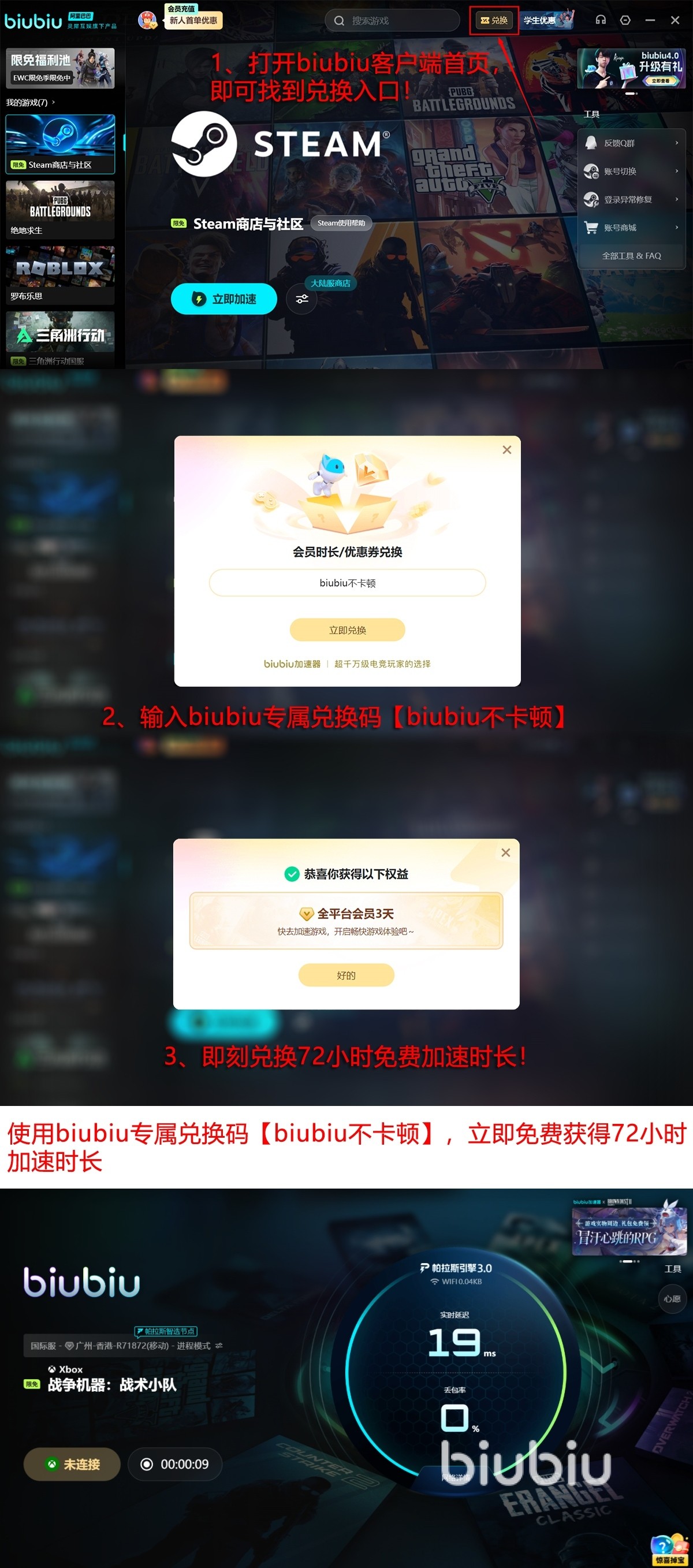 新用户注册后将自动获赠24小时全功能免费试用权益;所有账号还可凭口令【biubiu不卡顿】额外领取3天加速服务时长,零门槛体验全程流畅战术推演。