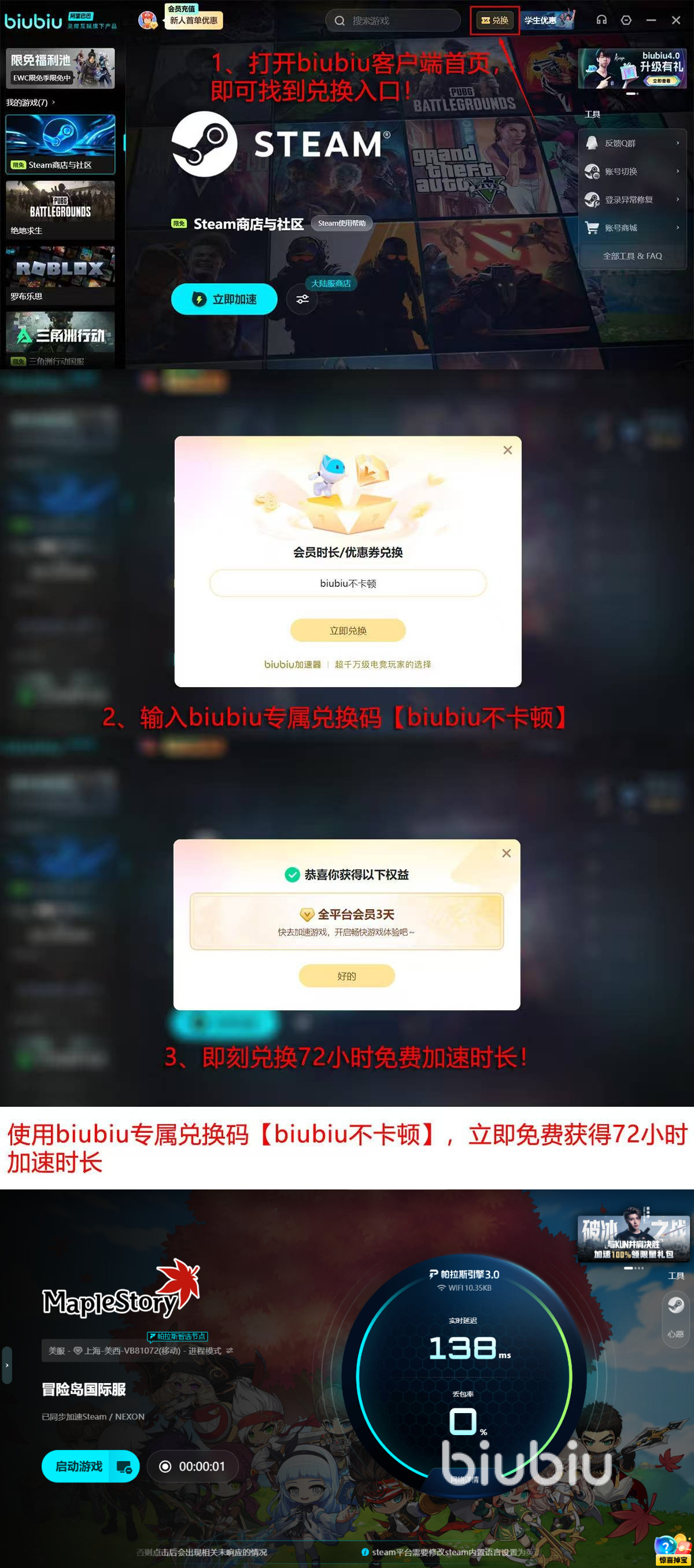 新用户注册biubiu加速器后,即可自动获得24小时全功能免费试用权限;同时额外开放《冒险岛》专属福利——72小时不限时加速体验。两项权益叠加,总计可享连续四天的高级加速服务,充分满足新玩家熟悉机制、老玩家回归冲榜的多样化需求。