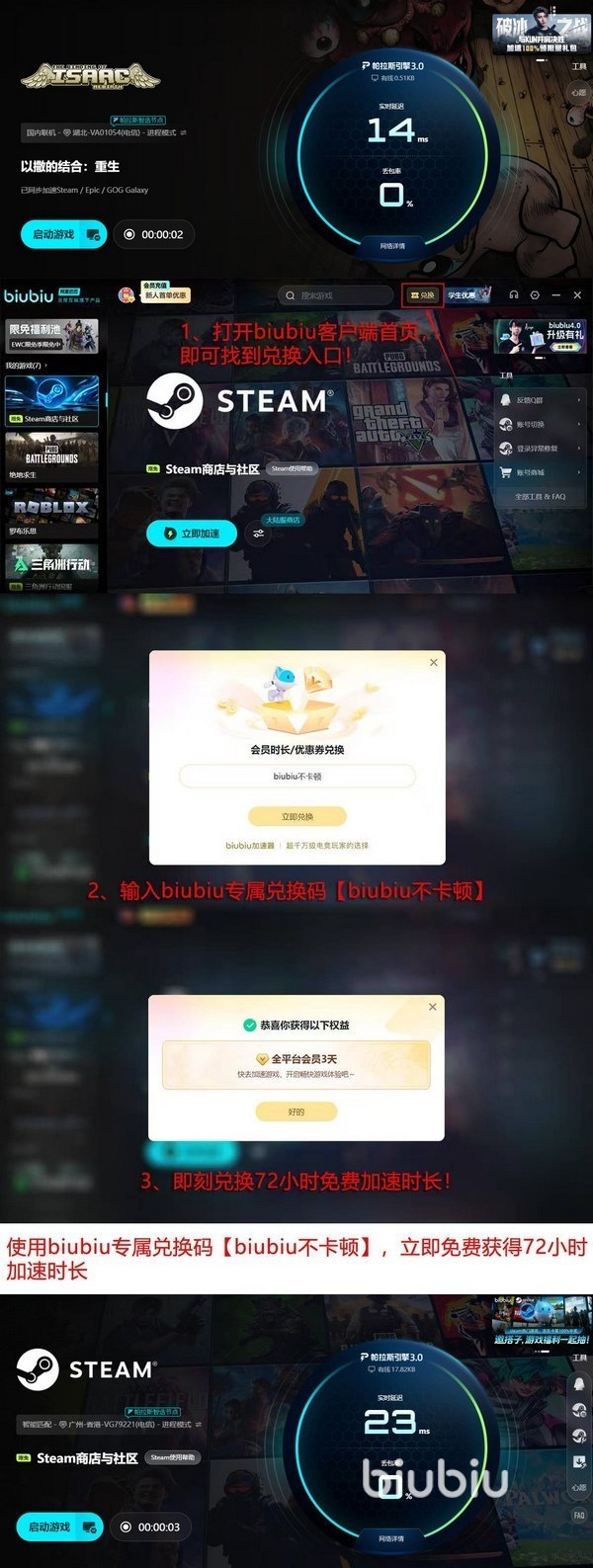 近期biubiu加速器完成重要版本迭代,邀请PUBG职业选手小叮当参与实机压力测试与参数调优,新策略进一步强化了弱网环境下的容错能力与连接韧性。新用户注册后可立即获得24小时全功能试用权限;输入专属兑换码“biubiu不卡顿”,还可额外激活72小时加速服务。该口令面向所有用户开放,不限新老账号。综合计算,新用户最高可享96小时连续加速时长,完全覆盖《以撒的结合》联机全流程体验周期。