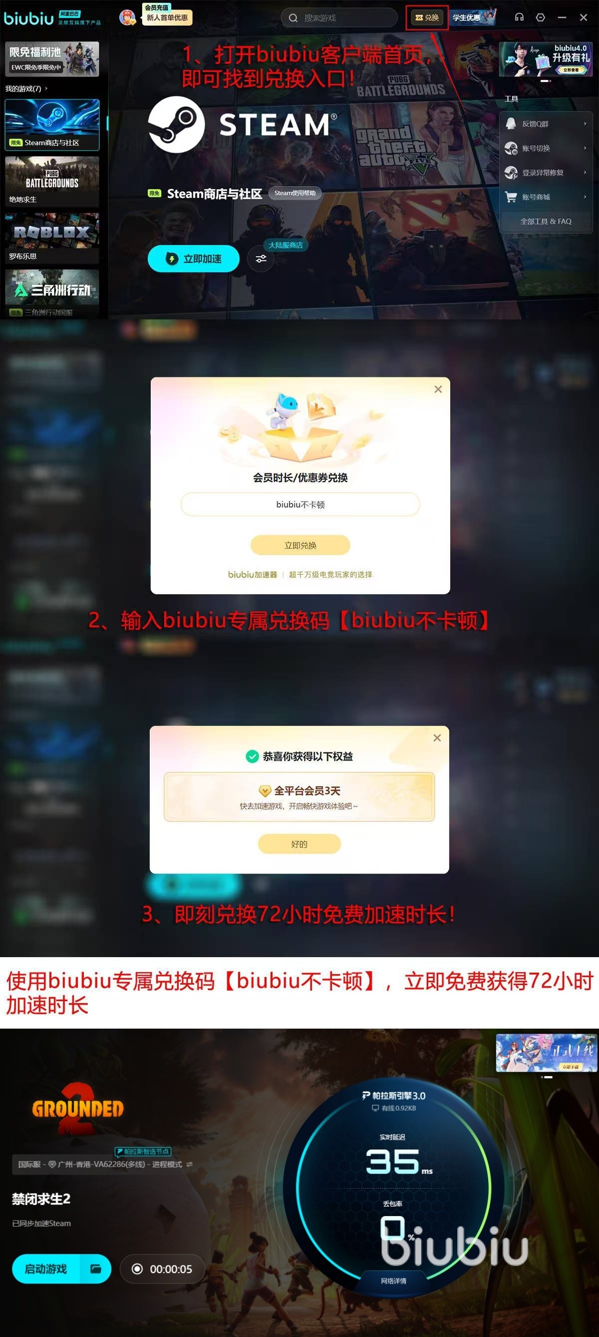 新用户完成首次注册后,即可获赠24小时免费加速时长;另输入兑换码【biubiu不卡顿】,还可追加72小时服务权限,累计达96小时,覆盖完整新手适应期与中期副本挑战周期,无需额外付费即可享受全程低延迟体验。