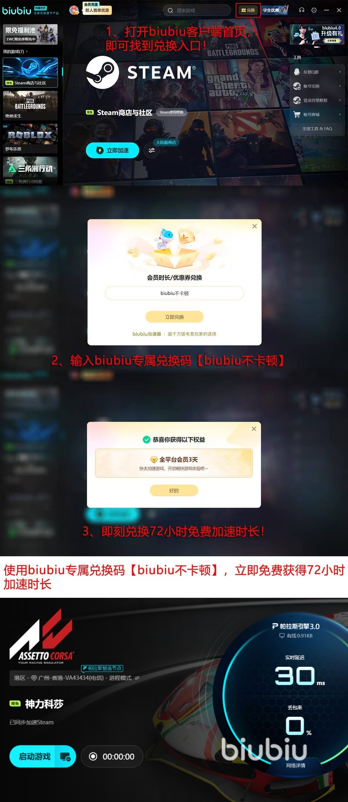 新用户注册并完成首次登录,即可领取24小时免费加速时长;输入专属兑换码【biubiu不卡顿】,还可额外获得72小时加速权限,累计达96小时,充分覆盖多时段、多地图的联机需求。
