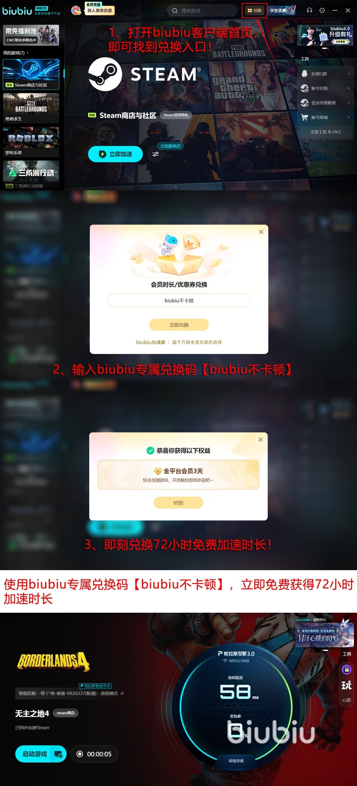 新用户注册即可领取24小时全功能试用权限,覆盖全部加速节点,无地域与时段限制。所有用户登录后,在首页点击“兑换中心”,输入口令【biubiu不卡顿】,还可额外获取72小时高级服务时长。两项权益叠加,最高可享累计96小时免费加速体验。