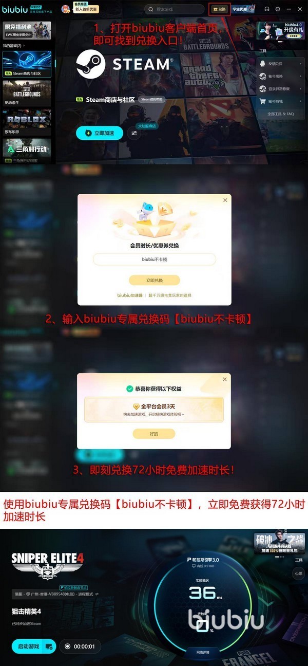 为降低用户尝试门槛,biubiu提供阶梯式免费体验机制:新用户完成注册登录后即获赠24小时基础试用时长;叠加口令“biubiu不卡顿”,还可额外兑换72小时高级服务权限,总计可达4天连续使用周期。该口令面向所有用户开放,限首次激活使用,输入时请确保全部字符为小写格式。