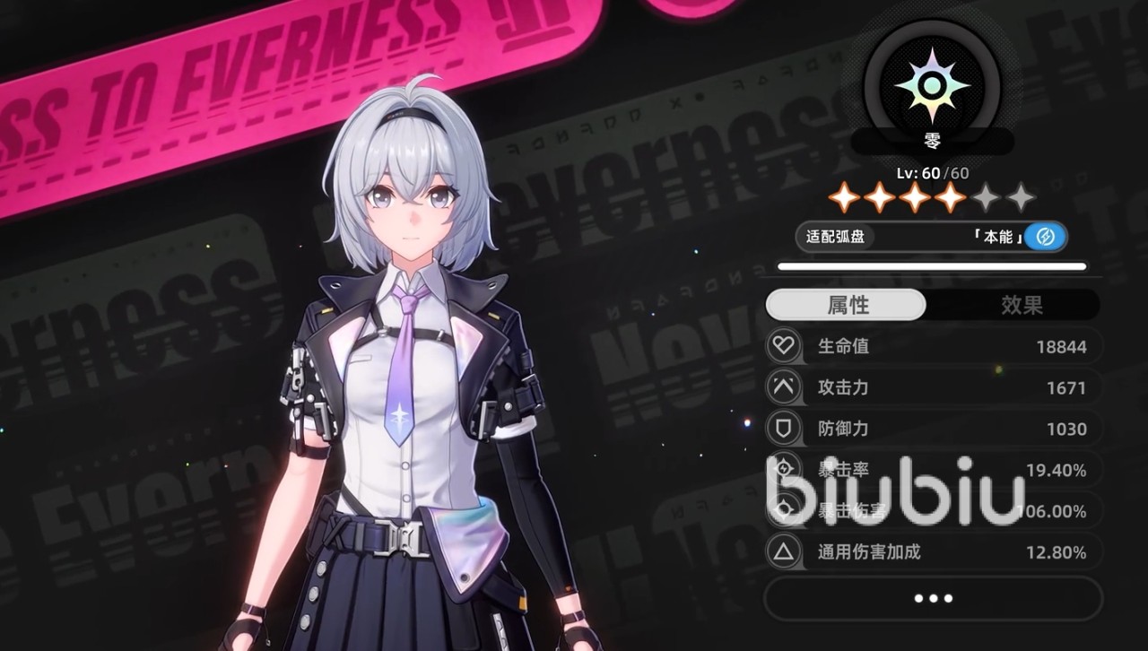 零的主动技能为三段前冲斩接空中蓄力异能炮。该异能炮属于光属性范围伤害,覆盖区域内所有目标均承受等量伤害;若首个命中的敌人等级不高于零自身等级,则额外对其施加一段200%倍率的单体光系伤害——此效果不可叠加至其他目标,仅作用于首个符合条件的单位。技能释放完毕后,零将即时获得100点环合系数,可立即与灵系角色协同发动环合,触发创生类增益效果。