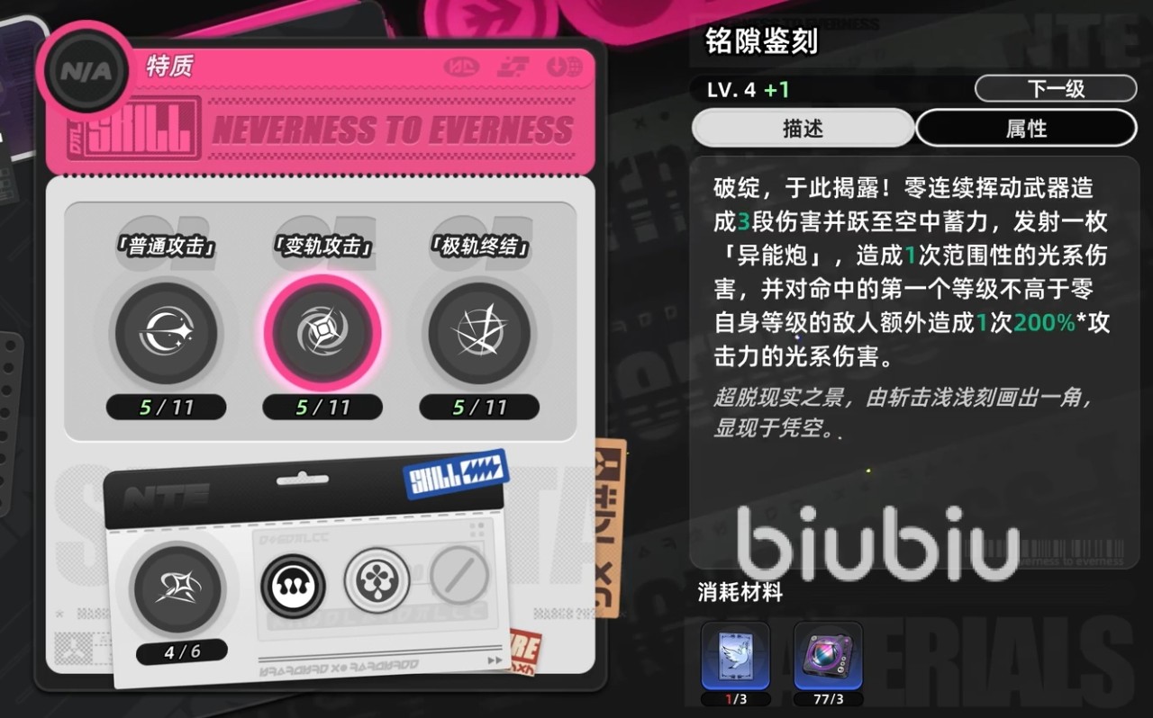 零的基础攻击共五段,具备环合系数积攒功能。其中第四段与第五段拥有显著更高的伤害倍率,因此在安全环境下建议完整打出整套连段以最大化输出效率。若遭遇高压压制,则应优先采用闪避或弹反建立节奏——当成功规避敌方攻击后,可立即衔接普攻触发闪避反击,造成高倍率光属性范围伤害,该机制在应对群怪与精英敌人时尤为关键。此外,空中普攻会令零垂直下坠,以落点为中心释放小范围光属性冲击,适用于调整站位与补刀收尾。