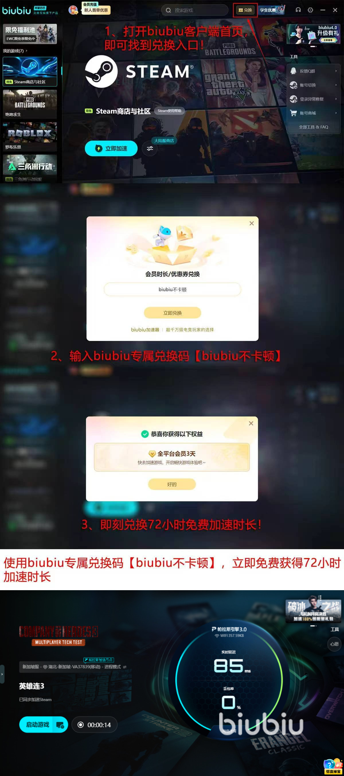 新用户注册即享双重加速权益:首次登录自动激活24小时全功能免费试用;输入兑换码【biubiu不卡顿】可额外领取72小时加速权限。两项福利叠加后,总计可获得96小时无限制加速服务。