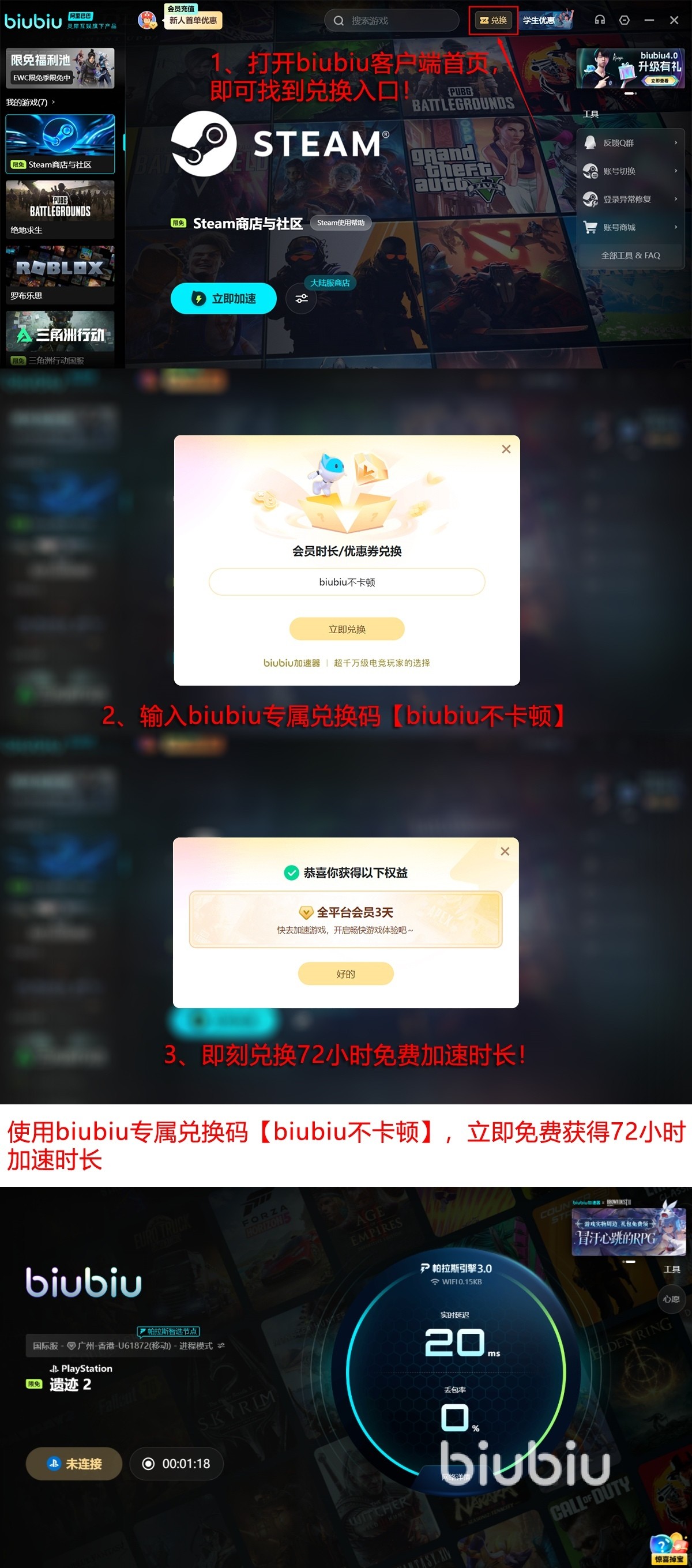 为降低用户尝试门槛,biubiu加速器推出多项新手权益:新注册用户可直接领取24小时全功能免费试用权限,无节点限制、无功能阉割;输入专属口令【biubiu不卡顿】,还可额外获赠3天高级服务时长,所有账号均可使用。
