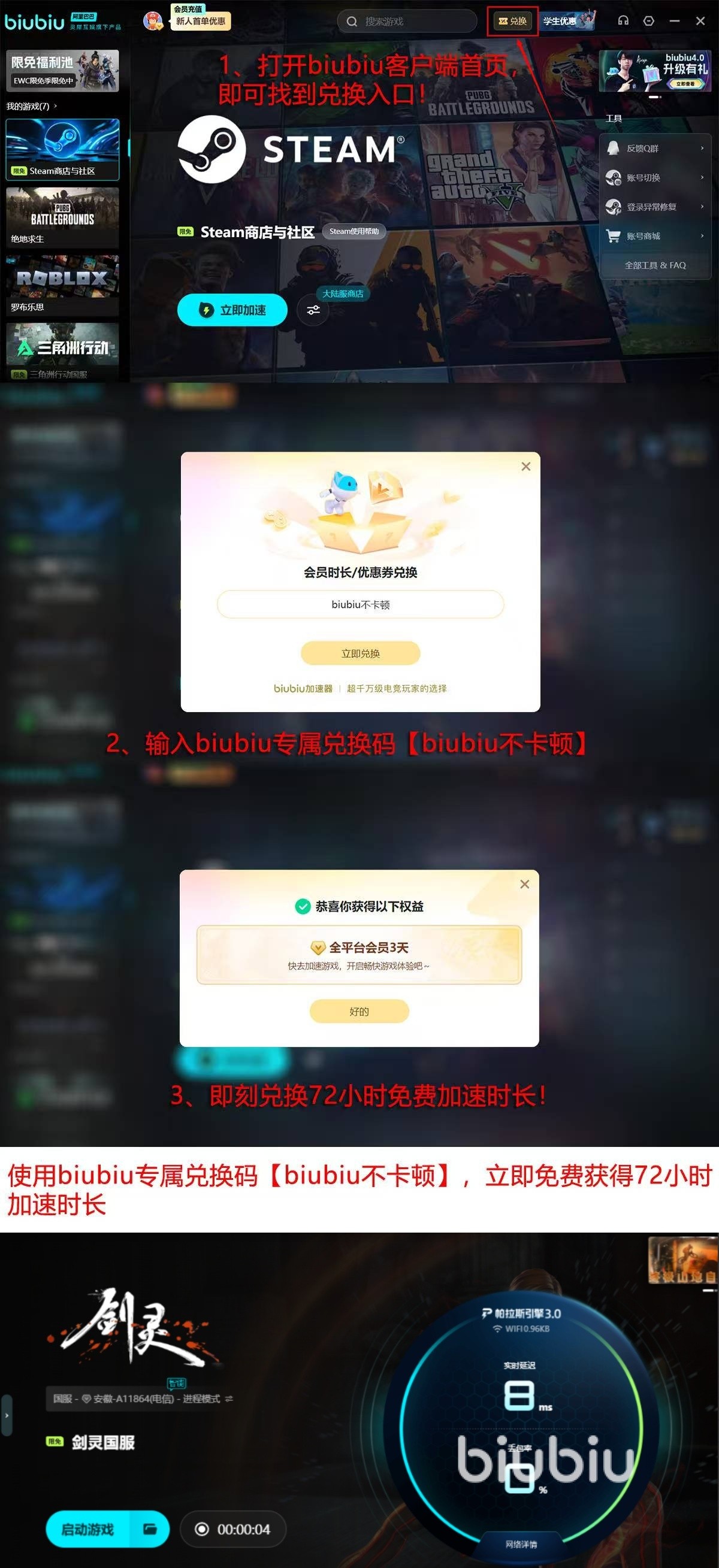 当前新用户注册即可领取24小时免费加速时长,满足完整开荒体验;叠加使用兑换码【biubiu不卡顿】,可额外获得72小时使用权,累计达96小时,覆盖新手期核心内容流程。
