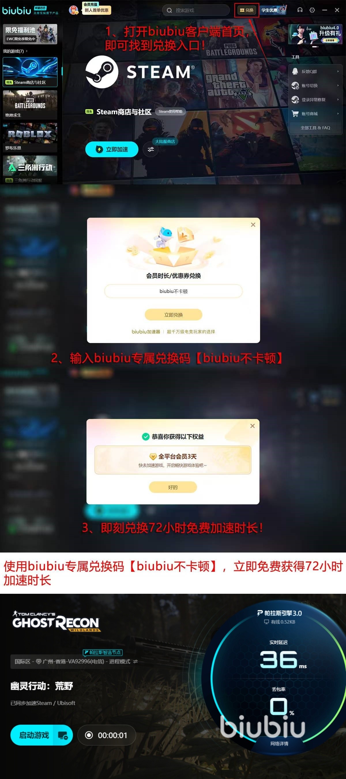 目前平台推出限时福利:所有用户凭暗号“biubiu不卡顿”即可领取3天免费加速时长;新用户完成注册后自动获赠24小时基础服务,两项权益叠加后,最高可享96小时连续加速体验,全程零费用接入。