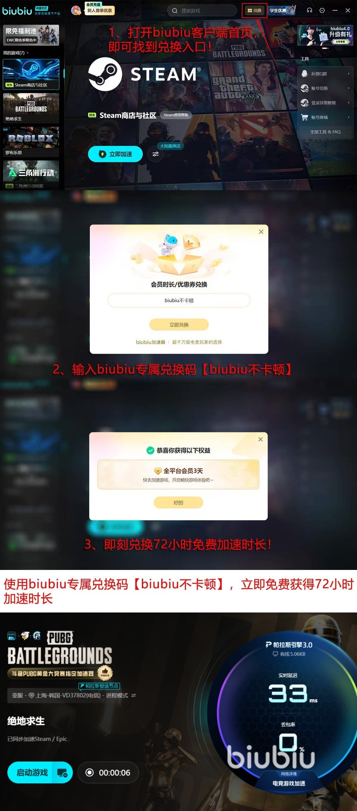 目前,biubiu加速器面向新用户提供首日免费体验权益——注册后即可享24小时全功能加速服务。若需延长试用周期,用户可在客户端内输入兑换码【biubiu不卡顿】,成功领取后额外获得3天连续加速权限,无需绑定支付方式,全程零门槛启用。